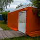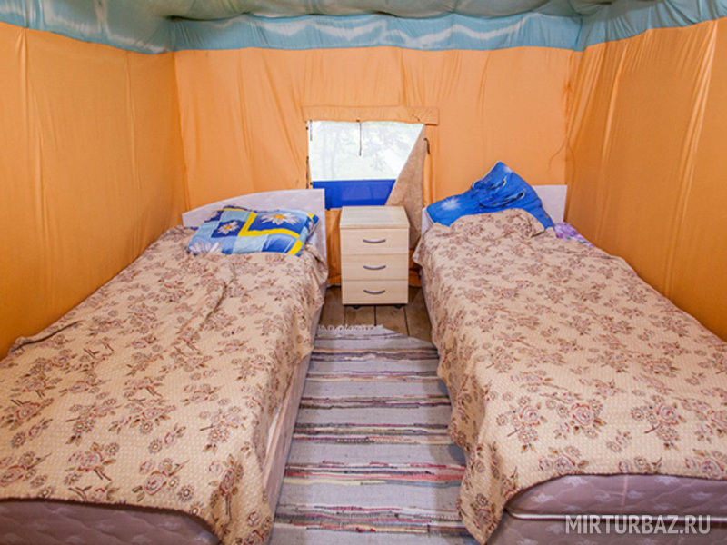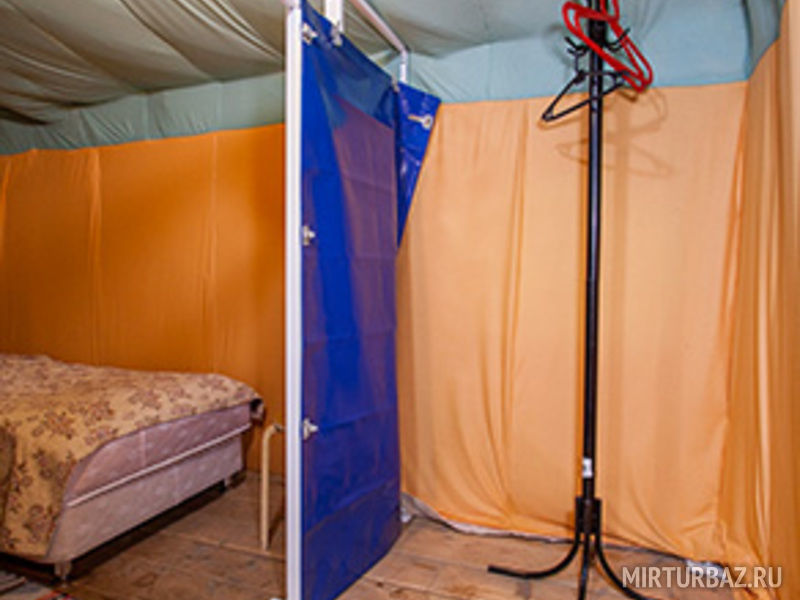 Тентовый домик установлен на деревянном помосте и подключен к электричеству: в нем есть свет, розетки для пользования электроприборами. Пространство состоит из прихожей и комнаты.