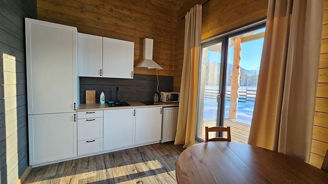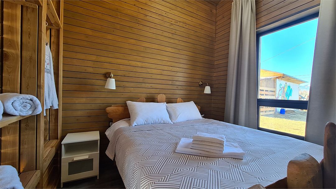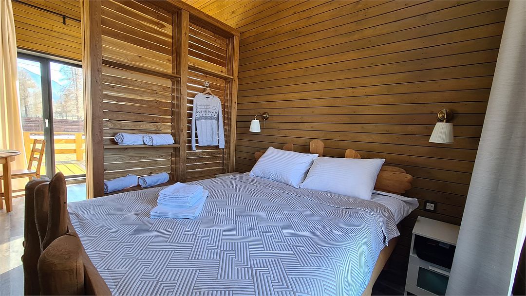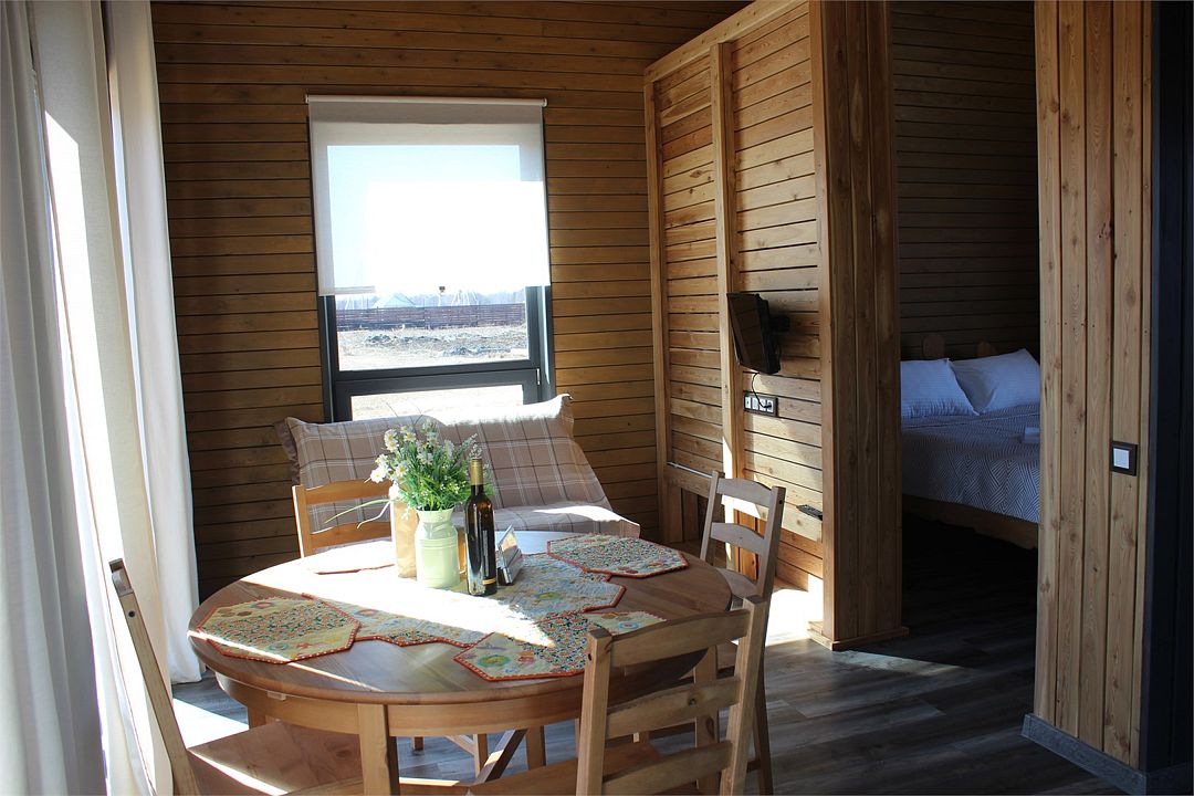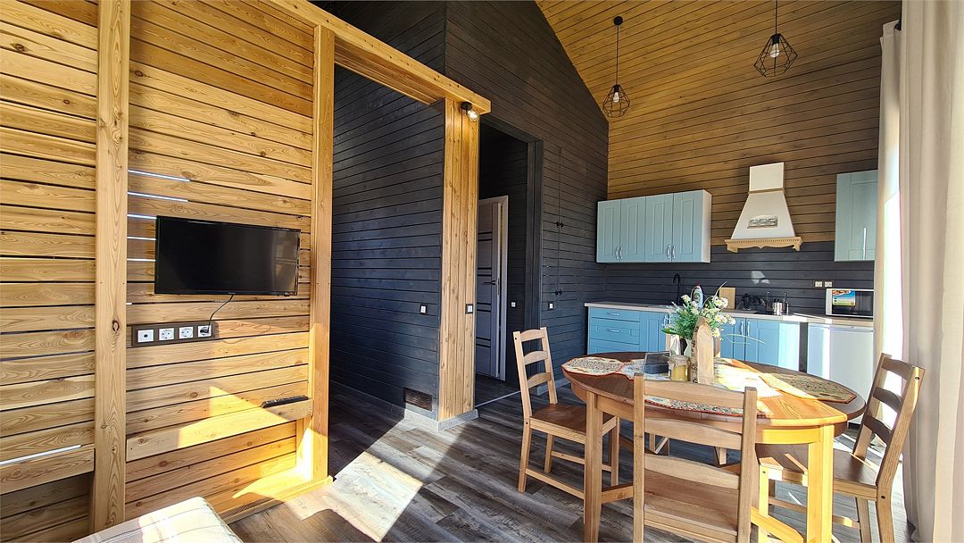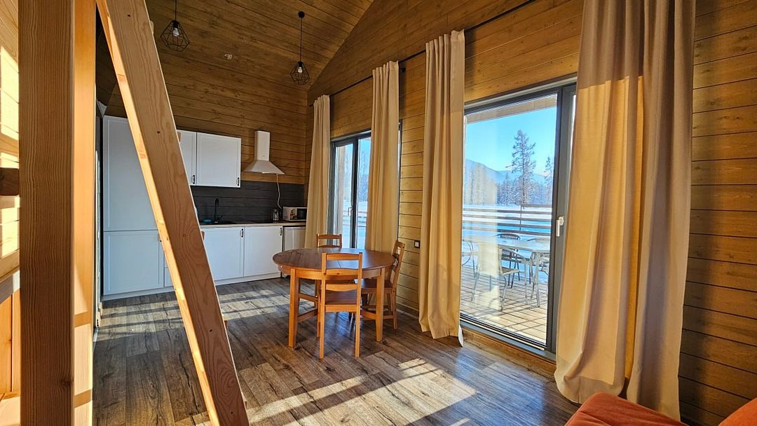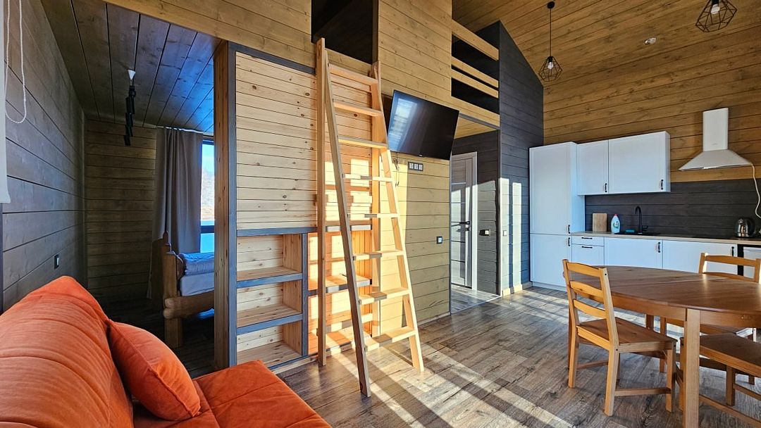 Домик со всеми удобствами и уютной террасой с видом на горы. Просторная гостиная с панорамными окнами, совмещенная с кухонной зоной. Современный санузел с душевой кабиной. Спальня с большой двуспальной кроватью и мансардными окнами на крыше.Услуги и удобства