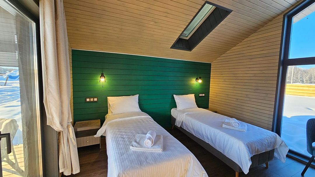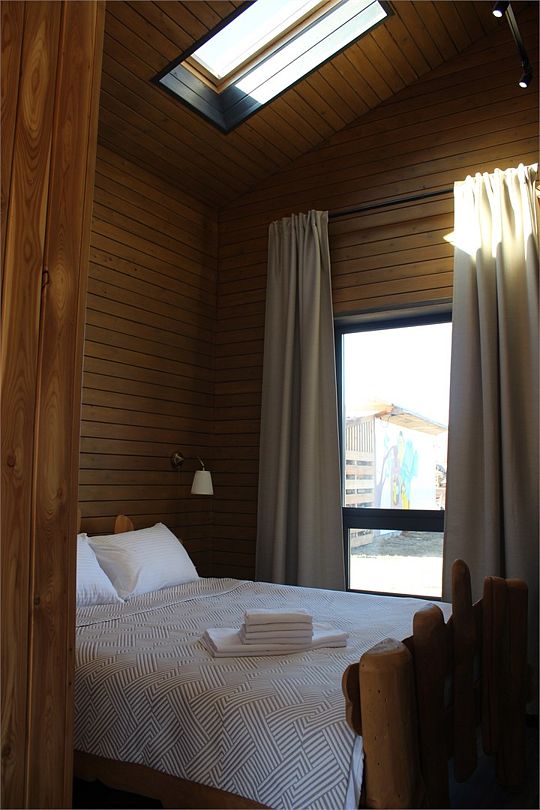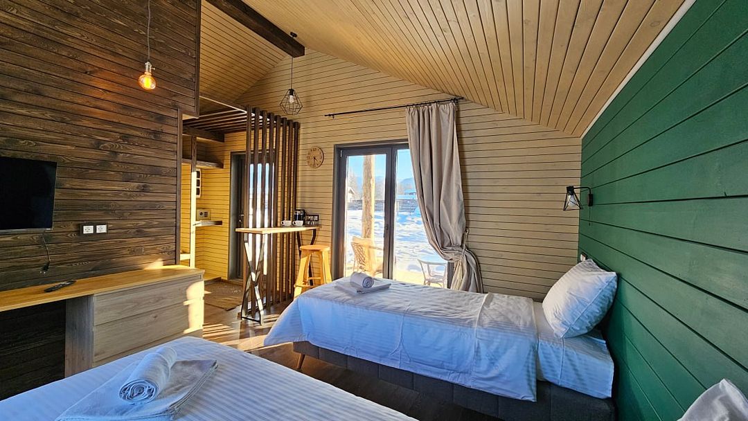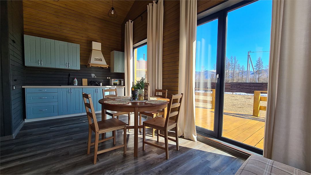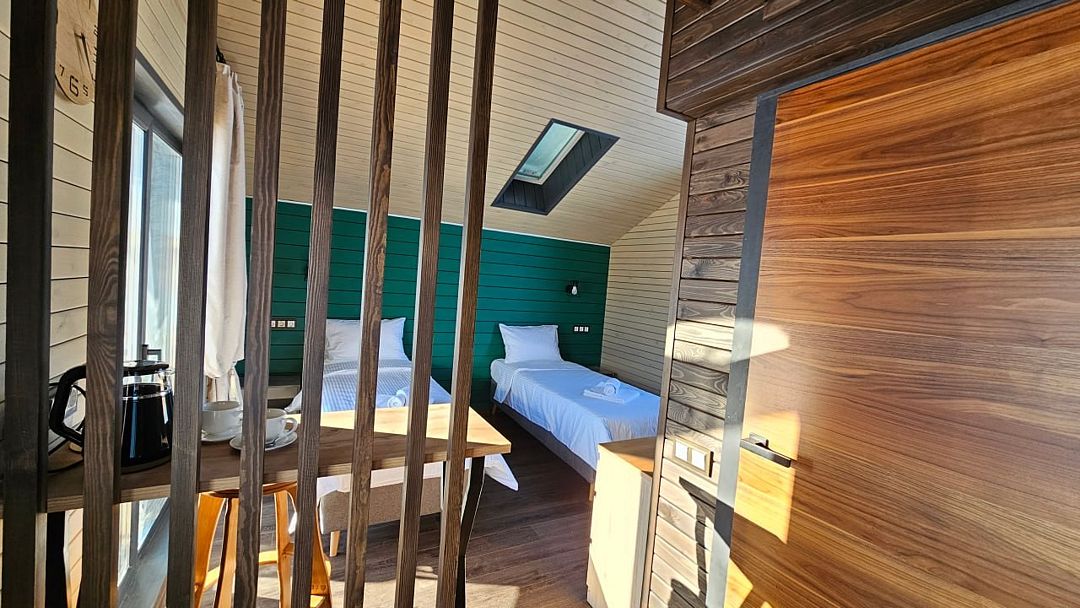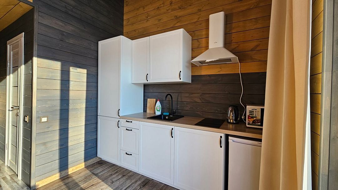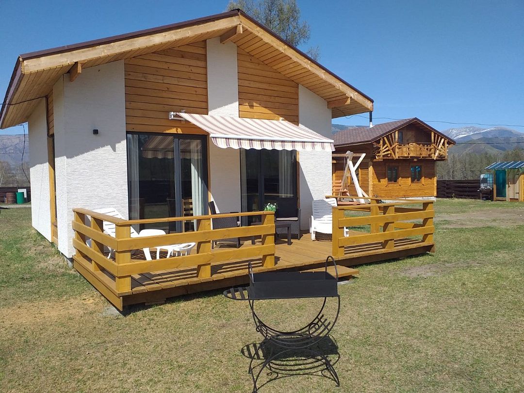 Домик со всеми удобствами и уютной террасой с видом на горы. Просторная гостиная с панорамными окнами, совмещенная с кухонной зоной. Современный санузел с душевой кабиной. Спальня с большой двуспальной кроватью и мансардными окнами на крыше.Услуги и удобства