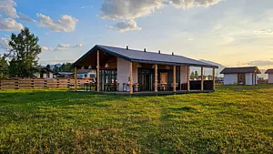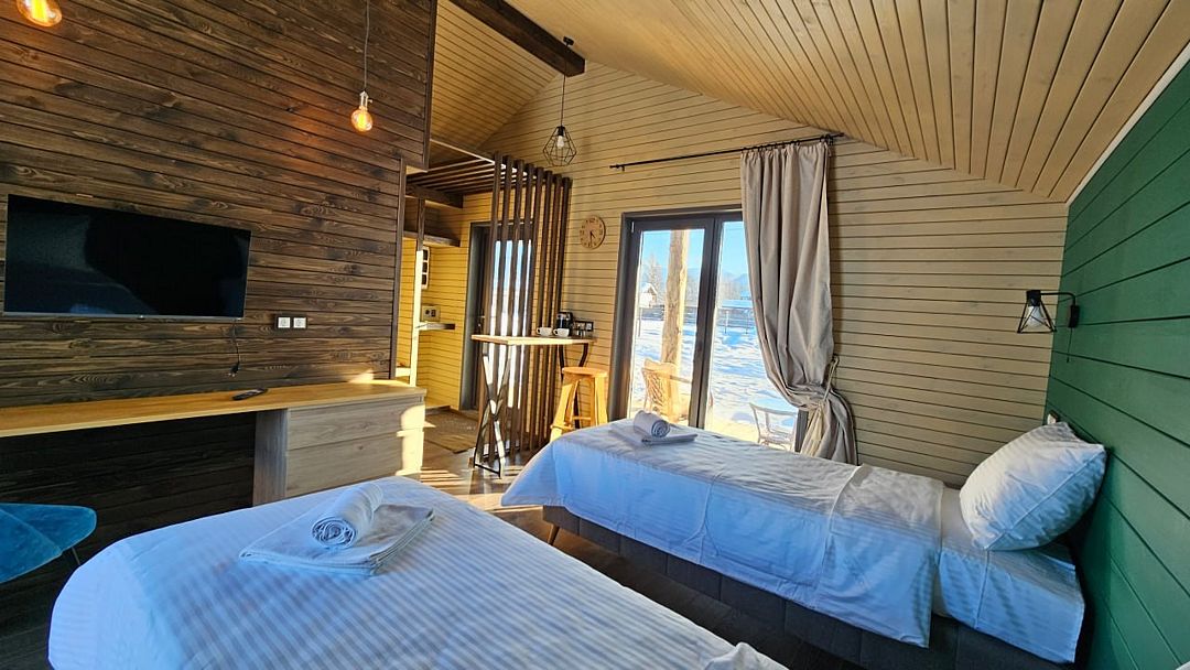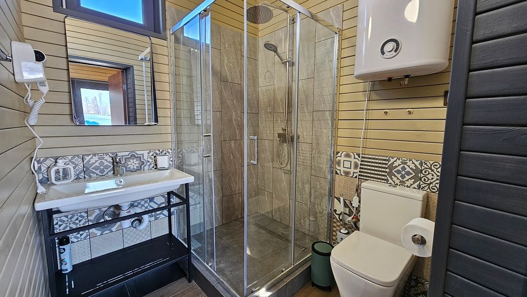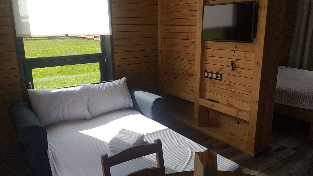 Современный комфортный дом для двух человек с комфортной кроватью Sprinbox, которую можно разделить на два спальных места или оформить в одно. Большая крытая терраса с индивидуальной мангальной зоной. Территория дома оборудована системой тёплых полов.Услуги и удобства