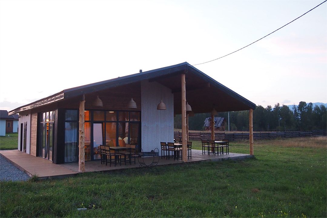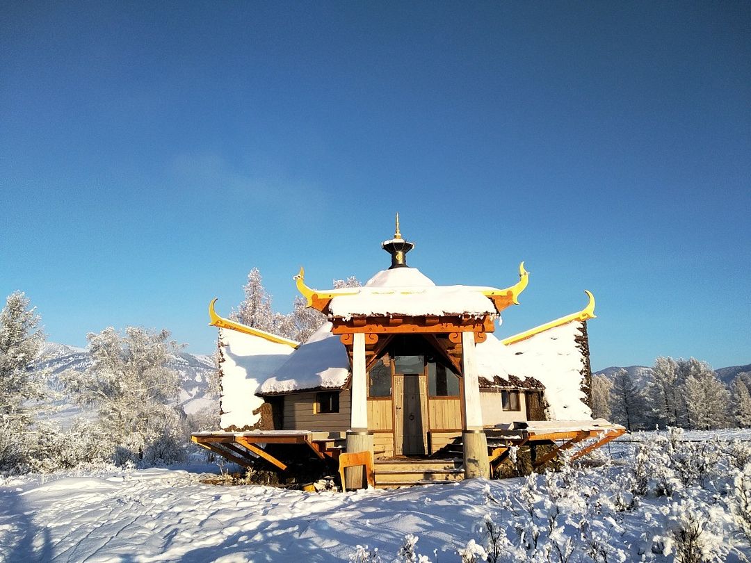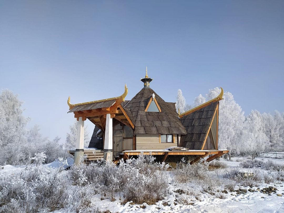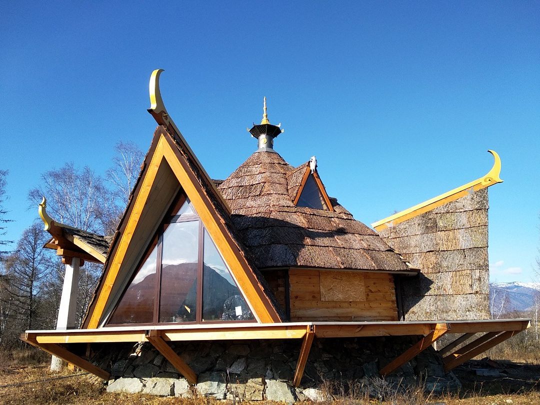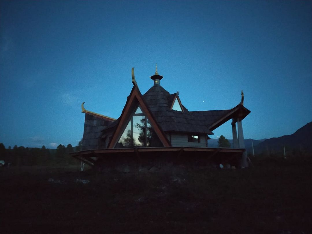 Дом Дракона стоит прямо над обрывом высокого берега Катуни и хорошо виден своей маленькой золотой пагодой проплывающим плотам и лодкам. Здание построено из кедрового бруса и обшито снаружи лиственницей. В плане оно представляет из себя мандалу - сложную геометрическую форму напоминающую многоугольник и наделенную в буддизме магической силой. Дом Дракона спроектирован петербургским архитектором Алексеем Новиковым в 2017 году. В этом проекте сочетаются черты национального алтайского пирамидального жилья Аила - крытого корой лиственницы, и элементы монгольской культовой архитектуры. По словам архитектора, который к слову прилетал дважды на место строительства и размечал ориентацию здания, рассчитывал углы падения солнечного света и виды из каждого эркерного окна, - это фьюжн традиций кочевой и степной архитектуры с современными элементами комфорта. Жизнь в Доме Дракона вращается в прямом смысле вокруг огня: по центру многосветного пространства ( в самой высокой точке достигающего семь с половиной метров) расположена чаша очага. Из любой точки здания всегда видно мерцания языков пламени. В интерьере использовано много произведений искусства перекликающихся с алтайской культурой. Центральный эркер украшают две культовые маски буддийской Мистерии Цам, выполненные получившим известность в Монголии, художником Сергеем Панчешным. На стенах развешаны седла работы алтайского мастера Эркина Баинова из села Купчегень. Все детали дома включая массивные кованные сундуки (ведь у кочевников не было шкафов), спроектированы и выполнены в едином стиле.Услуги и удобства