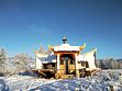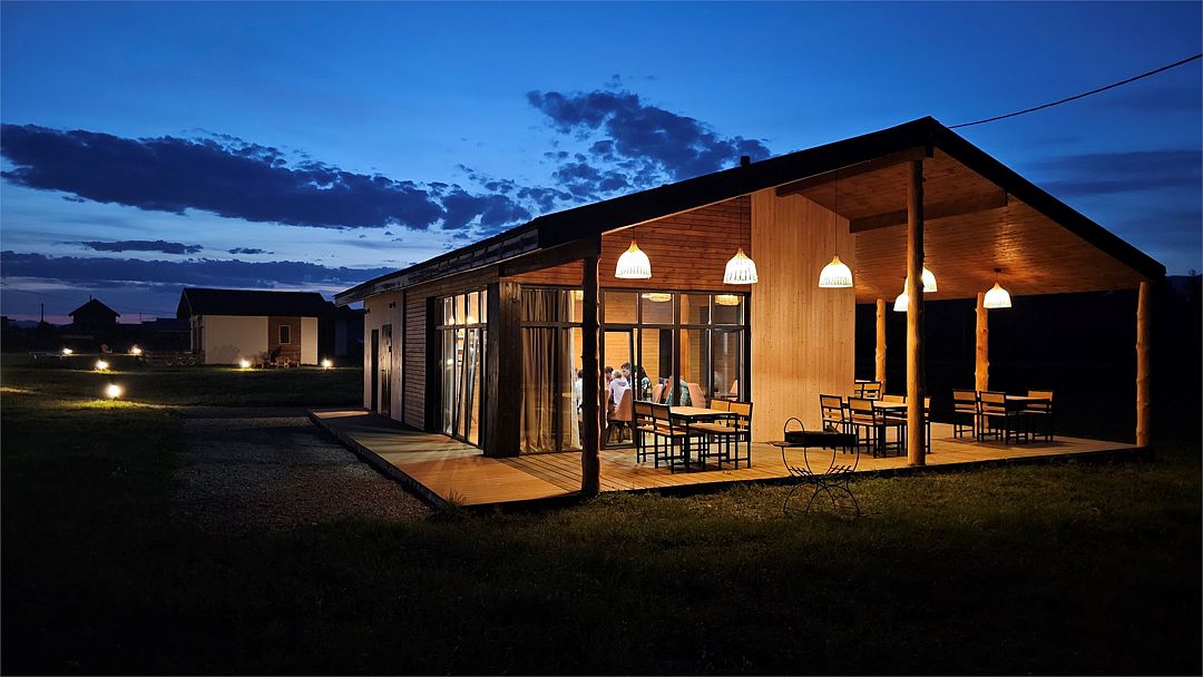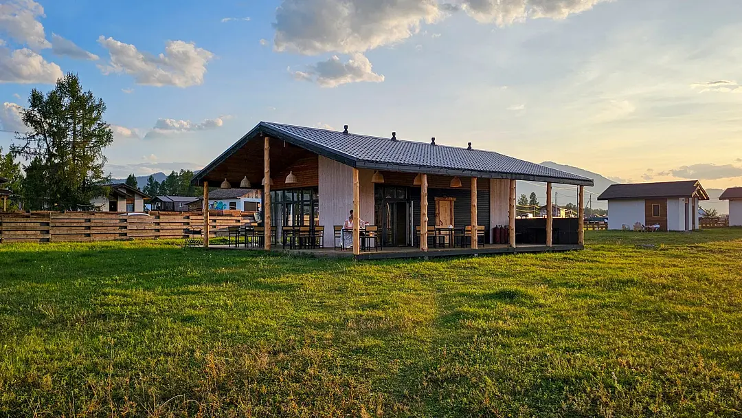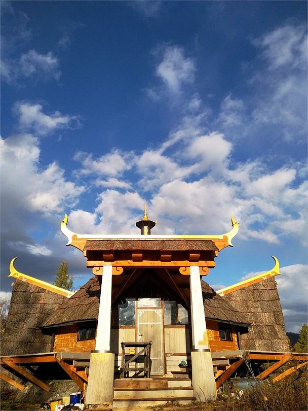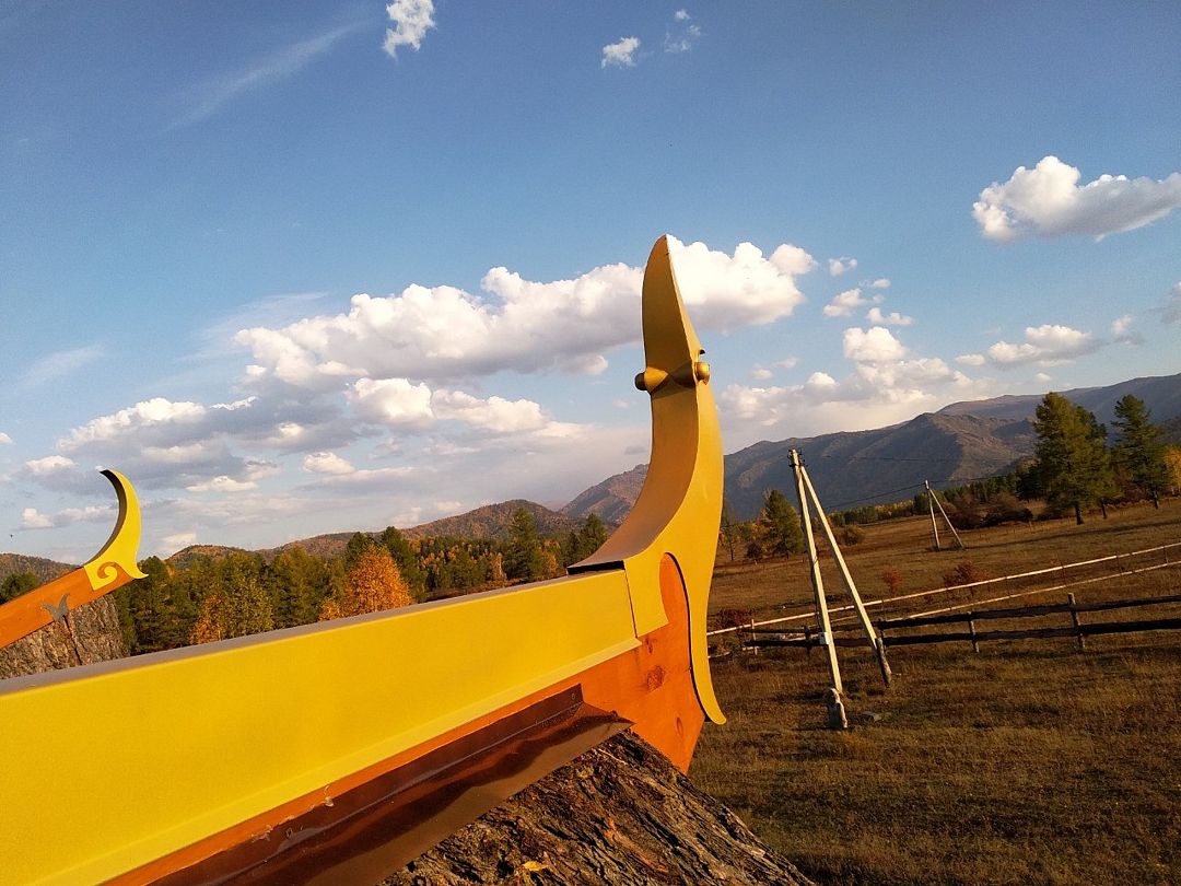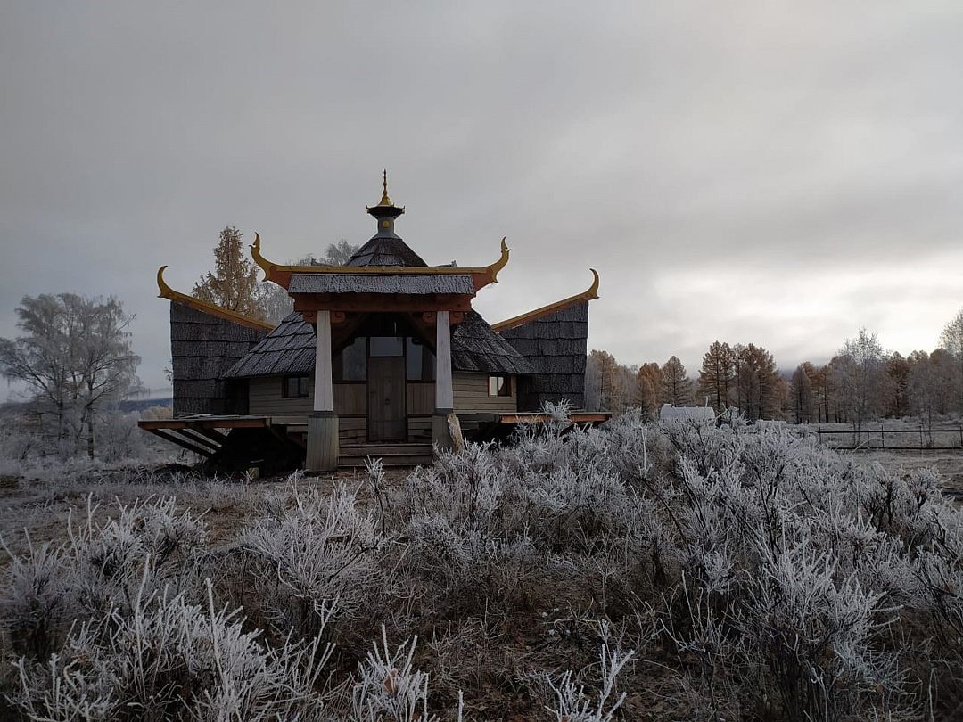 Дом Дракона стоит прямо над обрывом высокого берега Катуни и хорошо виден своей маленькой золотой пагодой проплывающим плотам и лодкам. Здание построено из кедрового бруса и обшито снаружи лиственницей. В плане оно представляет из себя мандалу - сложную геометрическую форму напоминающую многоугольник и наделенную в буддизме магической силой. Дом Дракона спроектирован петербургским архитектором Алексеем Новиковым в 2017 году. В этом проекте сочетаются черты национального алтайского пирамидального жилья Аила - крытого корой лиственницы, и элементы монгольской культовой архитектуры. По словам архитектора, который к слову прилетал дважды на место строительства и размечал ориентацию здания, рассчитывал углы падения солнечного света и виды из каждого эркерного окна, - это фьюжн традиций кочевой и степной архитектуры с современными элементами комфорта. Жизнь в Доме Дракона вращается в прямом смысле вокруг огня: по центру многосветного пространства ( в самой высокой точке достигающего семь с половиной метров) расположена чаша очага. Из любой точки здания всегда видно мерцания языков пламени. В интерьере использовано много произведений искусства перекликающихся с алтайской культурой. Центральный эркер украшают две культовые маски буддийской Мистерии Цам, выполненные получившим известность в Монголии, художником Сергеем Панчешным. На стенах развешаны седла работы алтайского мастера Эркина Баинова из села Купчегень. Все детали дома включая массивные кованные сундуки (ведь у кочевников не было шкафов), спроектированы и выполнены в едином стиле.Услуги и удобства