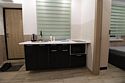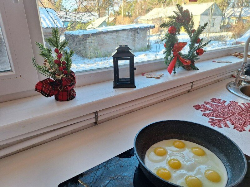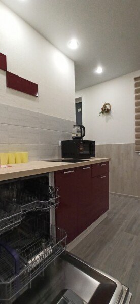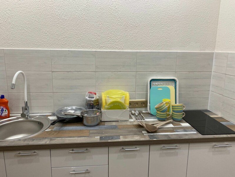 - кухня-гостиная с современной техникой для приготовления пищи. Большой холодильник с морозилкой — в нем сохранятся все продукты в свежем виде, индукционная плита — позволит быстро приготовить вкусную еду, СВЧ, чайник, посуда, кухонные принадлежности и яркая обеденная зона. Посудомоечная машина позволит не тратить время на мытье посуды, а насладиться любимыми делами и отдыхом.