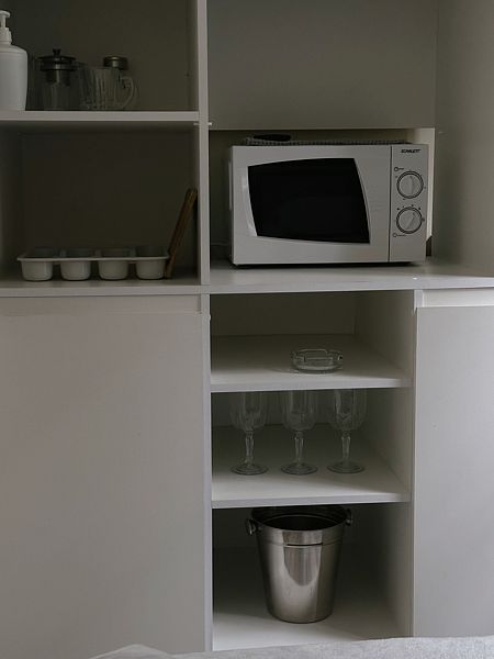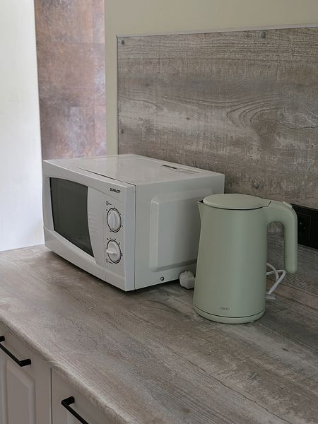 • Мини-кухня полностью оборудована: холодильник, индукционная плита, микроволновая печь, чайник, посуда, столовые приборы.