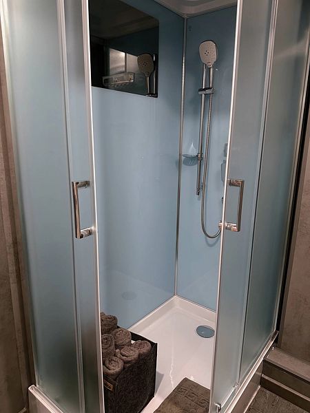 • В каждом домике – санузел с душевой кабиной и туалетом. Горячая вода постоянно. Гигиенические принадлежности (шампунь, гель для душа). Фен.