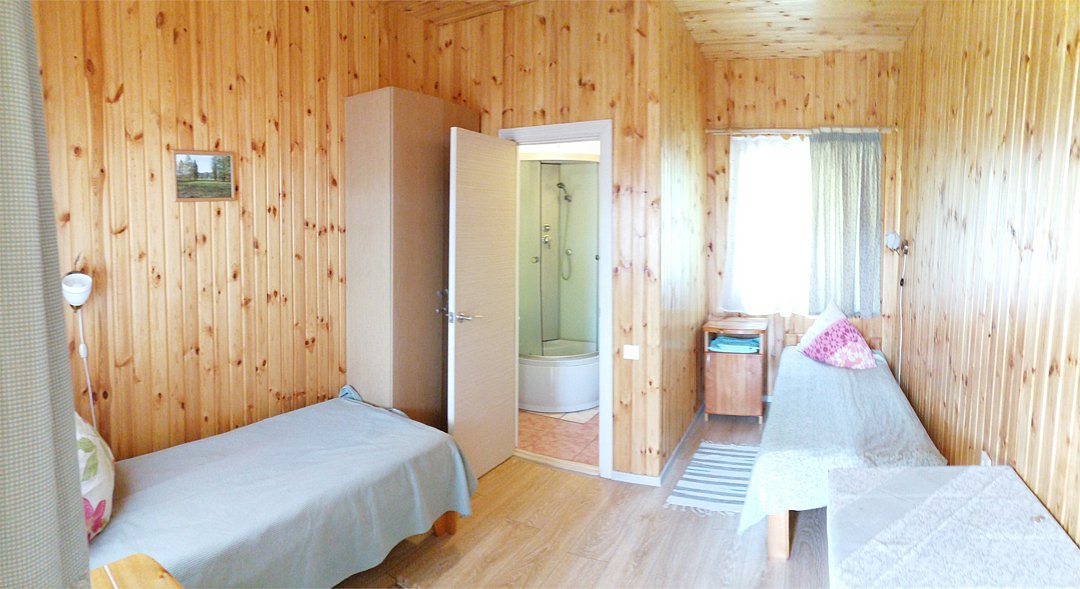 Уютные номера в кедровом доме, кровати раздельные, в комнатах шкаф, стол, стулья. Удобства на этаже.Трехместный кедровый