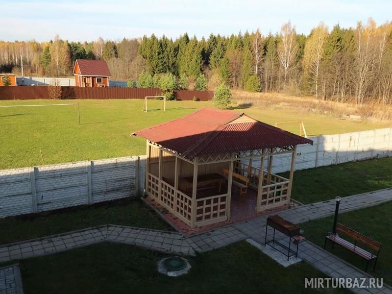 На территории коттеджа расположена шикарная двухэтажная финская сауна с большим предбанником, холлом и спальнями на втором этаже. А по соседству — уютная беседка с мангалом.