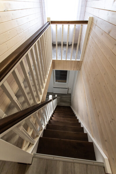 Две ванные комнаты с туалетом, раковиной и душевой кабиной, одна на каждом этаже. Просторная кухня, объединенная с гостиной, с панорамными окнами, которые позволяют наслаждаться видом на природу.