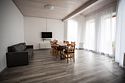 Кухня оснащена электрической варочной панелью, холодильником, микроволновой печью и чайником. В гостиной есть выход на открытую террасу, где вы можете наслаждаться свежим воздухом и видами на природу.