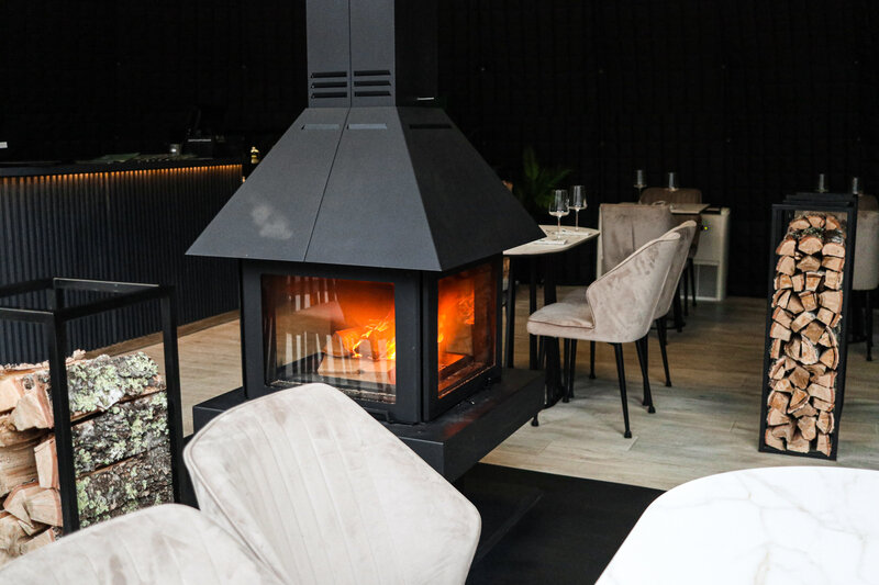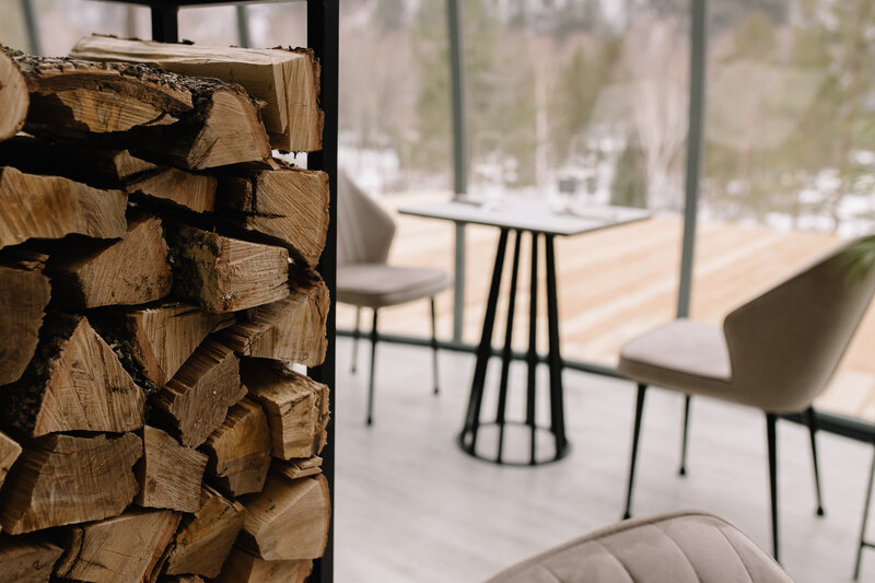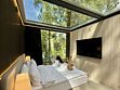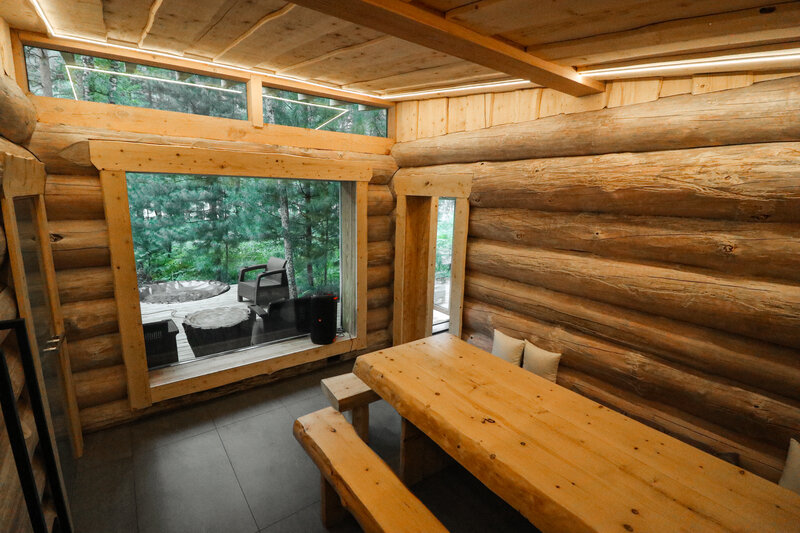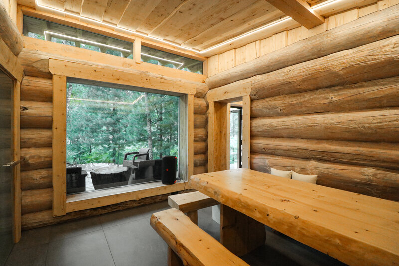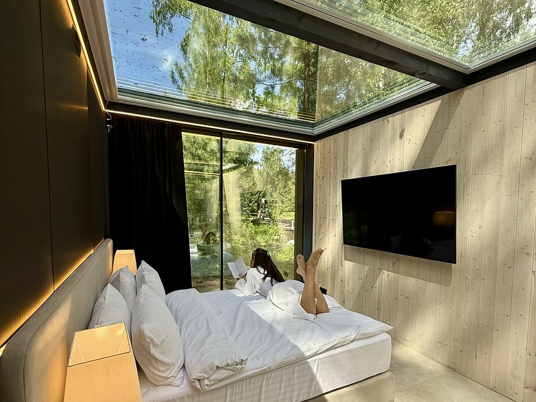 Дом с панорамным потолком и стенами погружает вас в атмосферу природы, не выходя из уюта. Идеален для романтического уикенда или отдыха вдвоем — с камином, ванной прямо в комнате и проектором вместо телевизора. Терраса с дизайнерской мебелью и собственная кухонная зона с барной стойкой делают этот дом по-настоящему особенным.