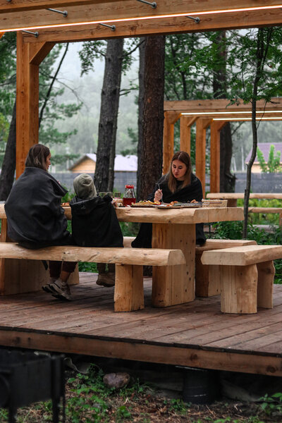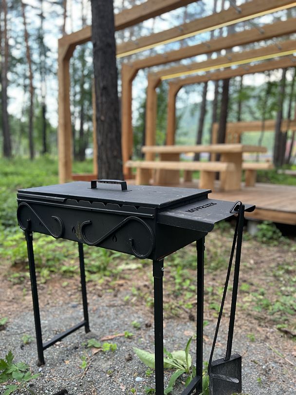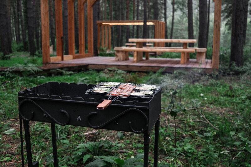 Беседки оснащены массивной деревянной мебелью, прозрачным навесом от дождя, мангалом, электричеством и освещением. Можно принести свой алкоголь и еду.Вместимость: 10−12 человек. Время посещения с 10:00 до 23:00.