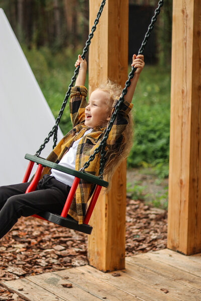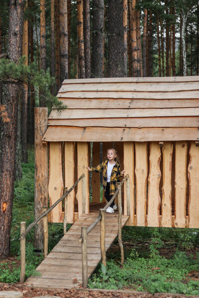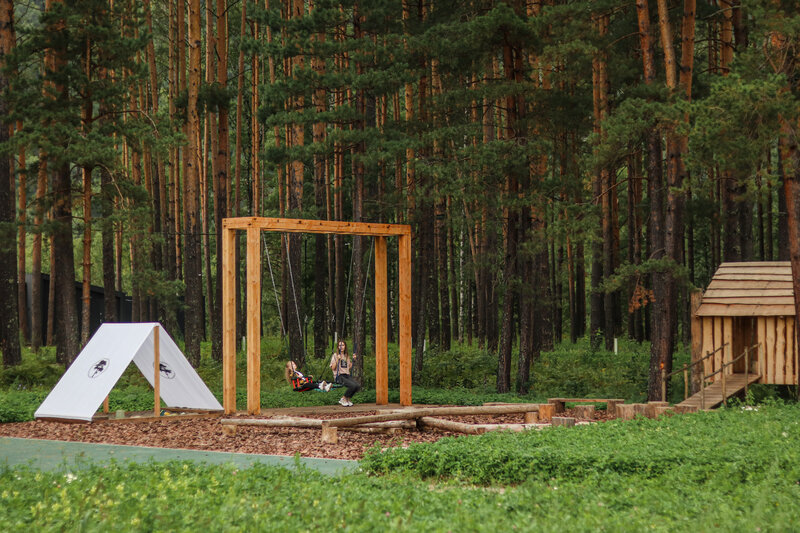Детская площадка в экостиле с домиком на дереве и качелями.