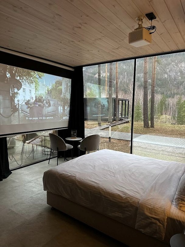 У каждого зеркального дома — собственная терраса с дизайнерской мебелью. Особенность номера - проектор с экраном и панорамное остекление в пол. В проживание включены завтраки “Шведский стол”.