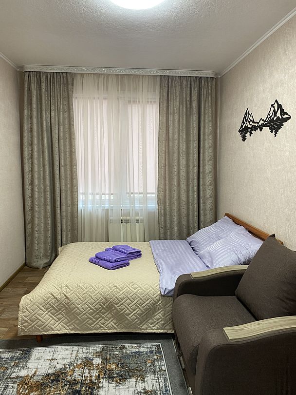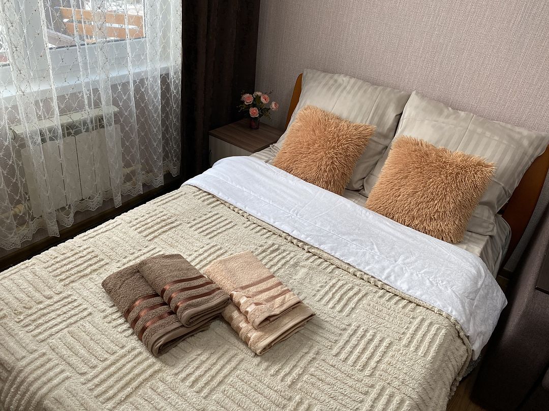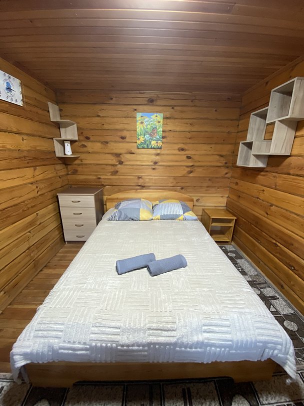 На первом этаже: 2 комнаты (кухня, спальня). В комнате: двуспальная кровать с постельными принадлежностями, прикроватная тумба, шкаф для одежды , полотенца для каждого гостя.