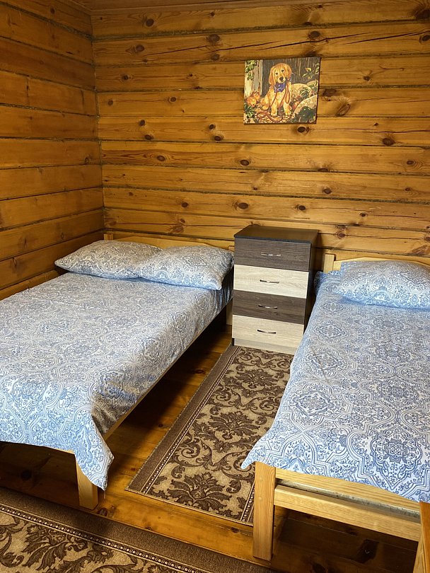 Второй этаж с двумя отдельными комнатами. В каждой комнате установлена двуспальная кровать и односпальная кровать с постельными принадлежностями, полотенца для каждого гостя, прикроватная тумба, комод, холодильник журнальный столик, настенная вешалка, зеркало.