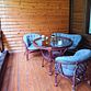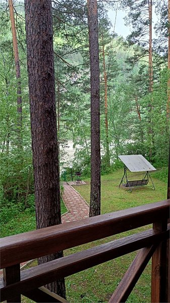 Большая терраса с видом на Катунь, оборудованная летней мебелью.