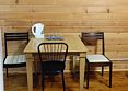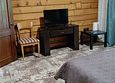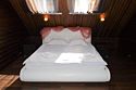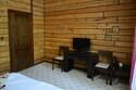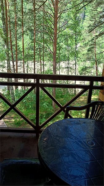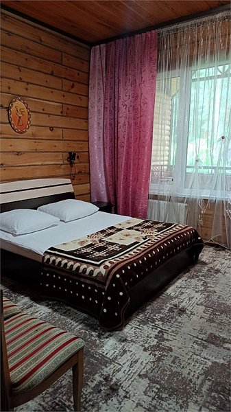 Большой свадебный номер с двумя зонами: спальная зона с двуспальной кроватью, 2-мя прикроватными тумбами, комодом с зеркалом; гостиная с 2-мя мягкими кожаными креслами и диваном, во второй комнате двуярусная кровать для детей, ЖК-телевизор, тумба под телевизор, барная стойка; холодильник, графин, стаканы, чайные пары; в прихожей шкаф-купе; туалетная комната с раковиной, зеркалом, WC, душевой кабиной, набором туалетных принадлежностей, фен, 2 махровых халата, тапочки. Большая терраса с видом на Катунь, оборудованная летней мебелью.