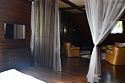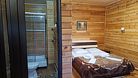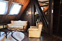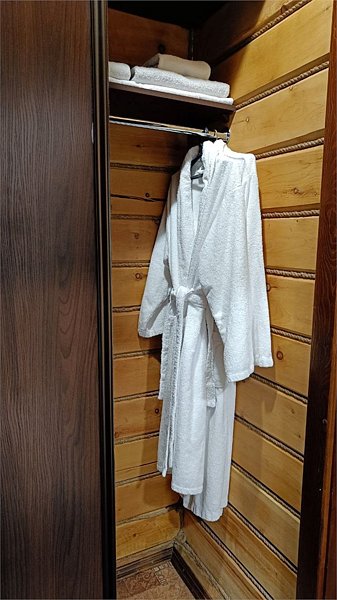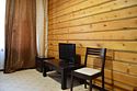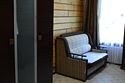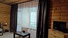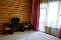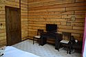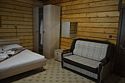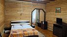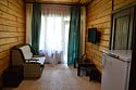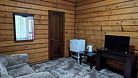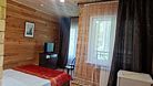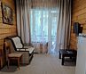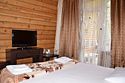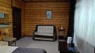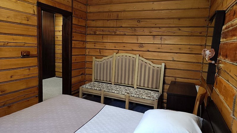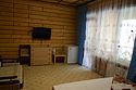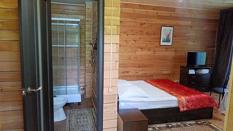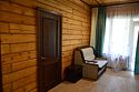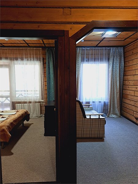 Комфортабельный трехкомнатный номер с двумя входами: один вход-терраса со стороны Катуни, оборудованный летней мебелью, второй — из главного корпуса; 2 комнаты с двуспальными кроватями, комодом и прикроватными тумбами, шкафом-купе; гостиная с диваном, ЖК-телевизором, тумбой под телевизор; в номере есть холодильник, фен, чайник, чайные пары, стаканы; туалетная комната с раковиной, зеркалом, WC, душевой кабиной, набором туалетных принадлежностей, 2 махровых халата, тапочки.