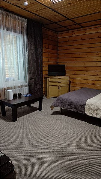 Одна комната с двуспальной кроватью и прикроватными тумбочками, телевизором, комодом; в номере есть холодильник, фен, чайник, чайные пары; туалетная комната с раковиной, зеркалом, WC, душевой кабиной, набором туалетных принадлежностей, тапочки.