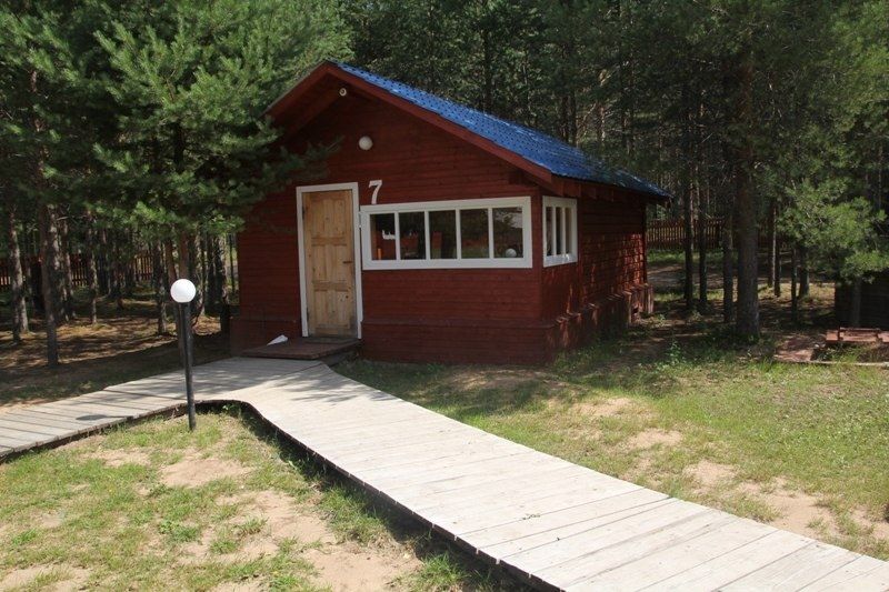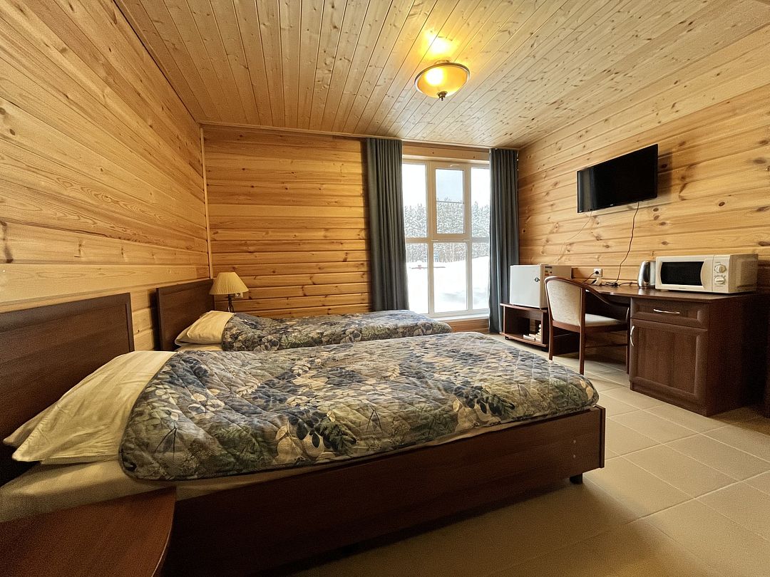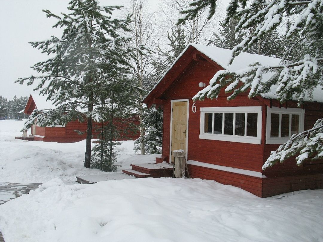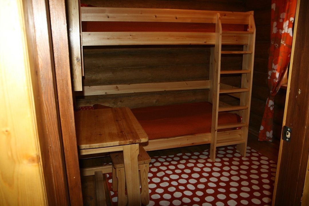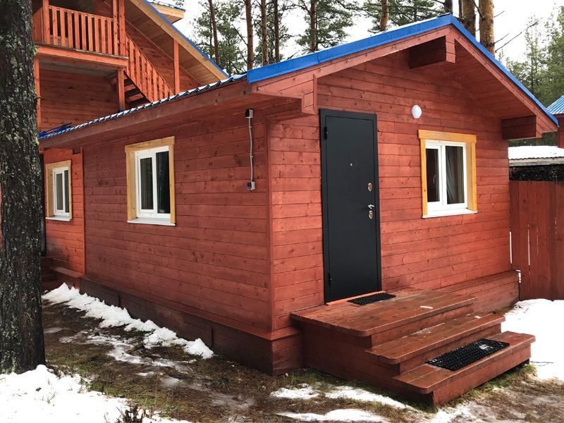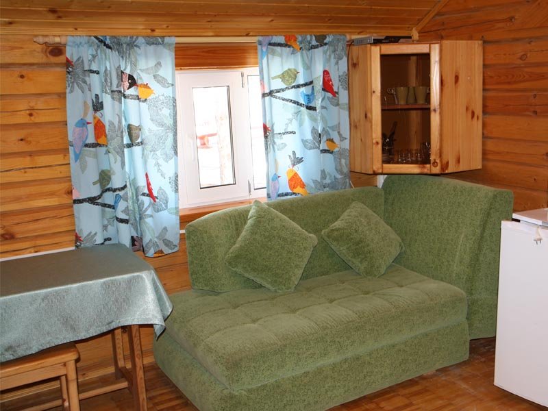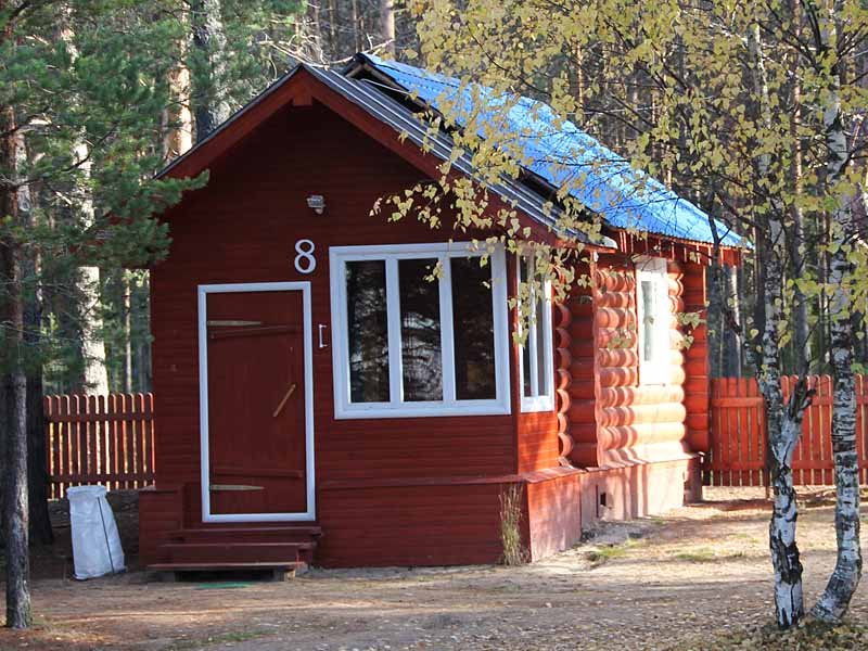 Одноэтажный коттедж на четыре человека. Состоит из одной комнаты для проживания, туалета/душевой, холодной веранды для хранения спортивного инвентаря. Кровати двухъярусные, врубленные в стену. Мини-кухня с чайником, микроволновой печью и холодильником.