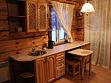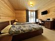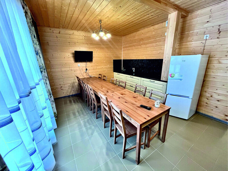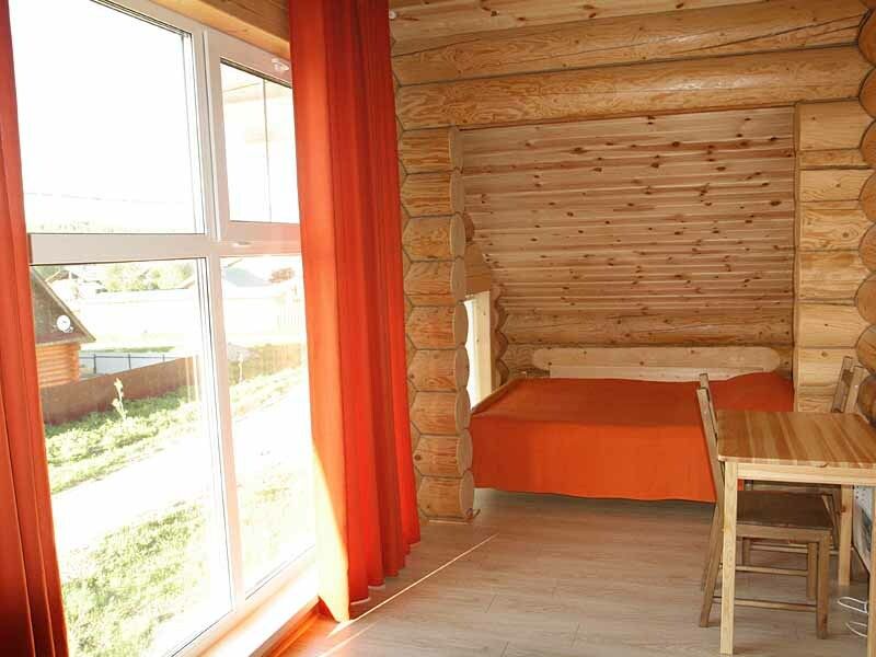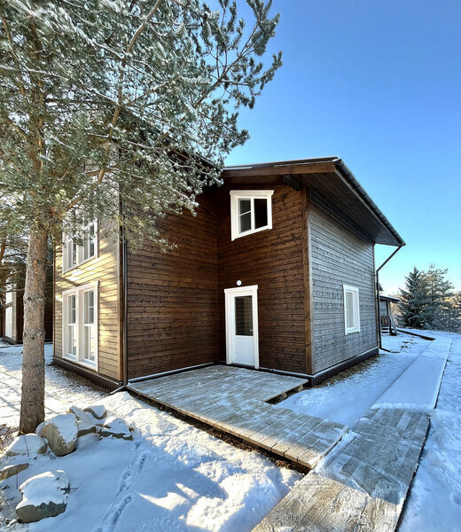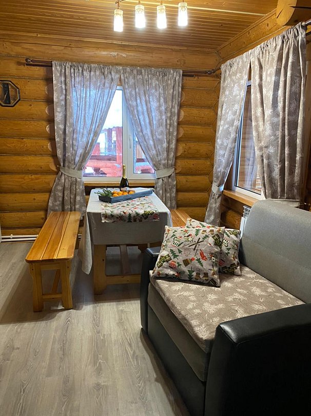 Двухэтажный коттедж на десять человек состоит из четырех спален, холла, двух санузлов, душевой, прихожей, есть мини кухня с микроволновой печью, холодильником и чайником. Дом расположен в нескольких метрах от кафе, в ста метрах от начала лыжных трасс, а также в двадцати метрах от реки Устья и русских бань комплекса.