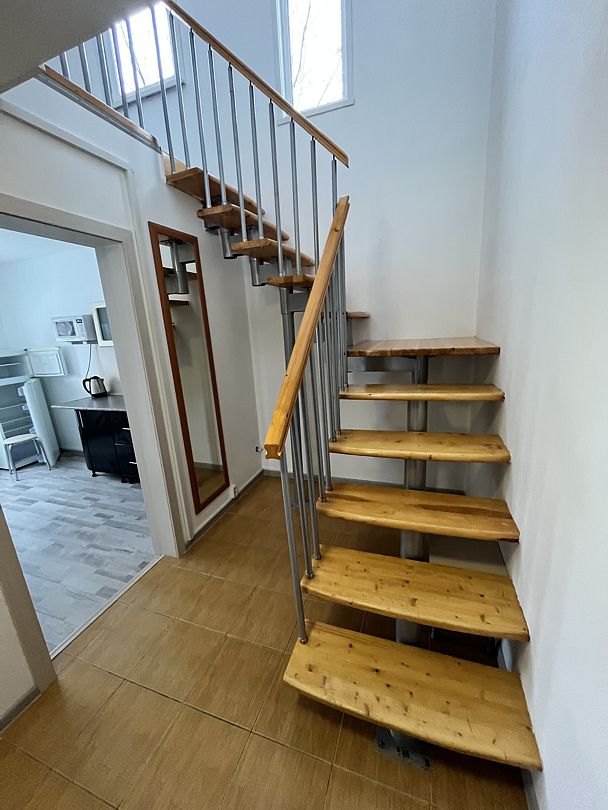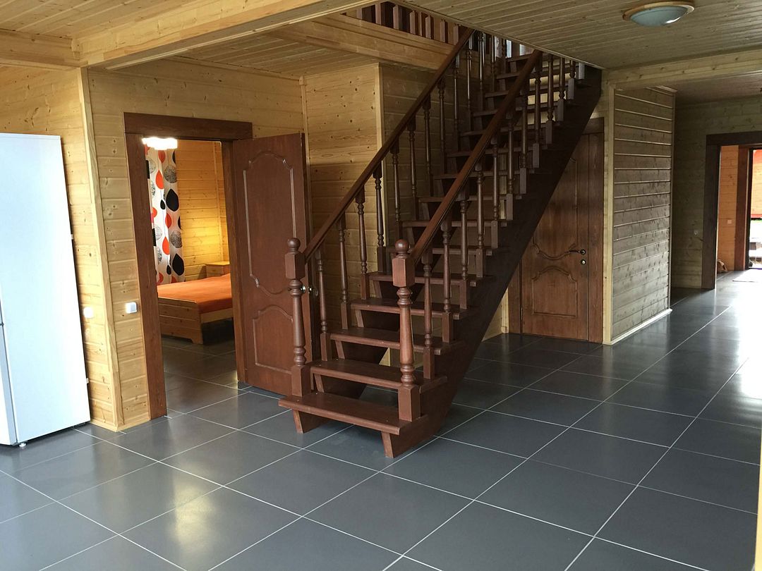 Коридор холодный с лестницей на второй этаж, есть много места для хранения спортивного инвентаря.