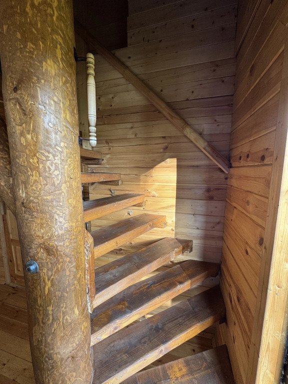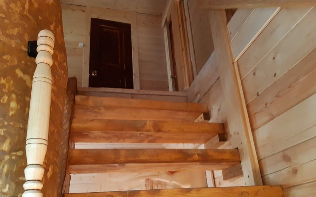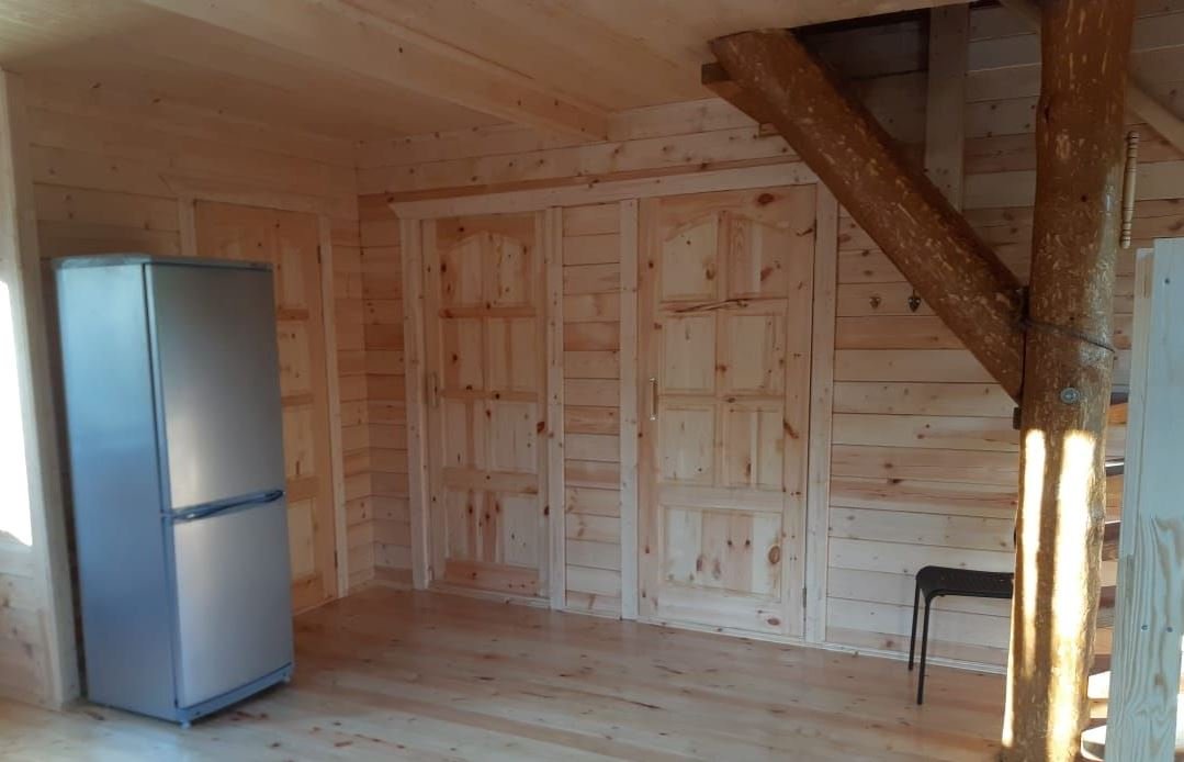 На первом этаже находится гостиная-кухня с печь-камином со стеклянной дверцей и телевизором, раздвижной диван, 2 спальни, туалет, душевая кабина. На втором этаже 2 спальни и санузел.