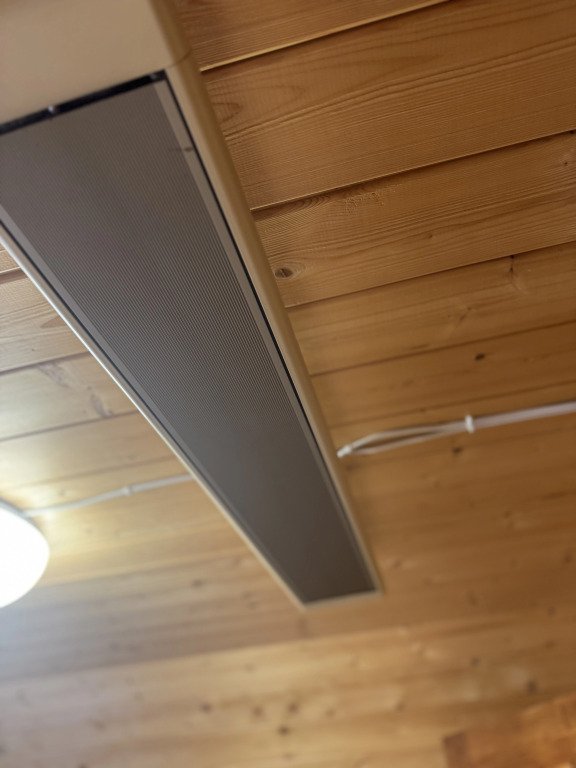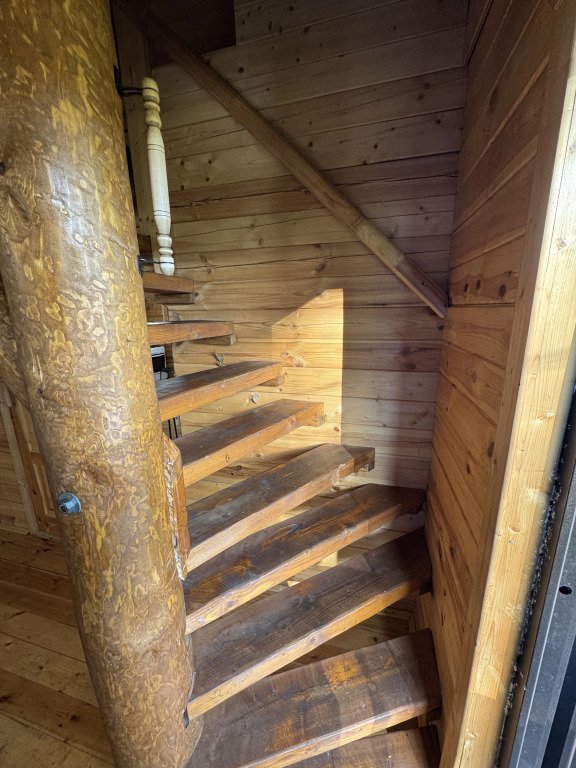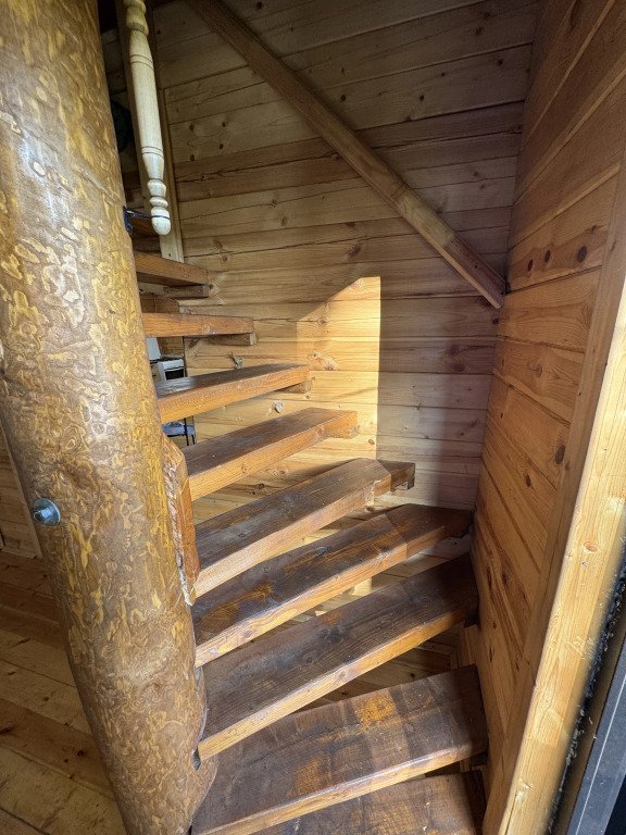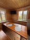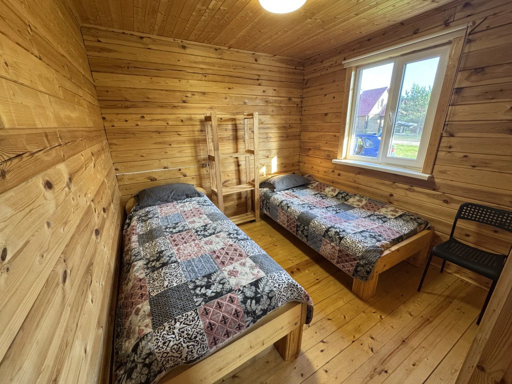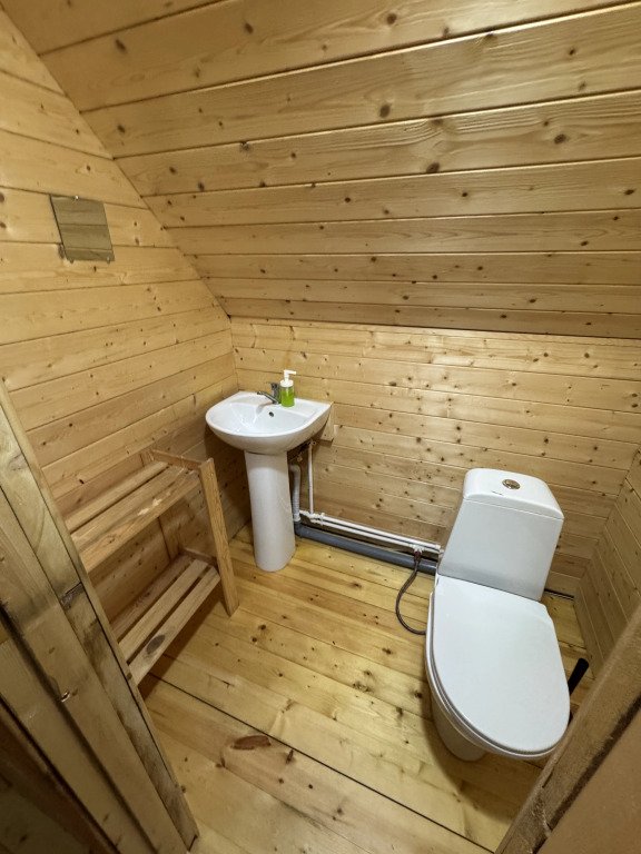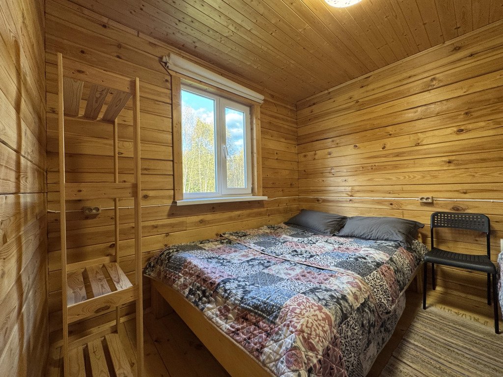 На первом этаже вы найдете уютную гостиную-кухню с печью-камином с стеклянной дверцей и телевизором, а также раздвижной диван. Здесь расположены две спальни: первая с двуспальной кроватью и вторая — с двумя односпальными кроватями. Также на этом этаже находятся туалет и душевая кабина.