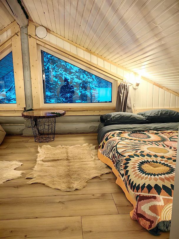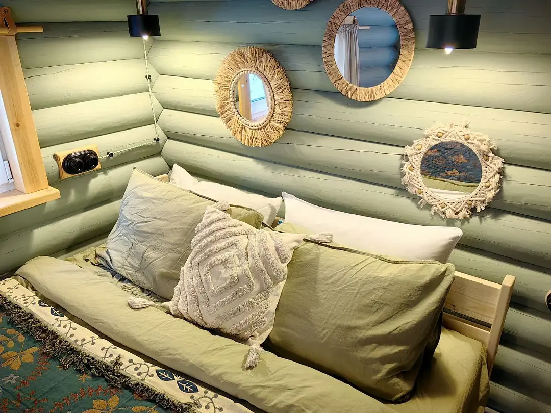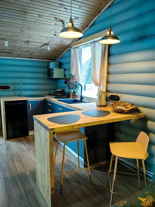 Дом сделан из бруса, с использованием природных материалов во внутренней отделке. Деревянные элементы обработаны безопасными маслами и красками. В окружении воды и сосен гарантирован здоровый сон.