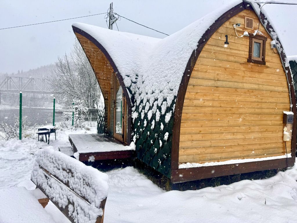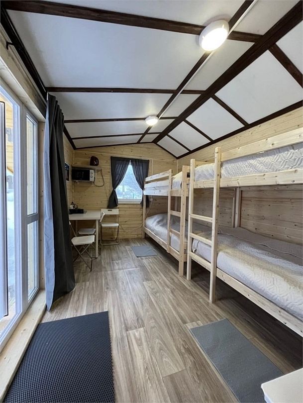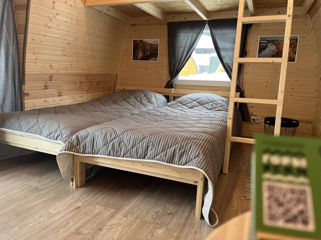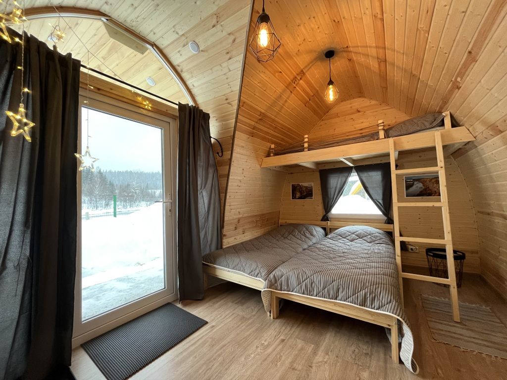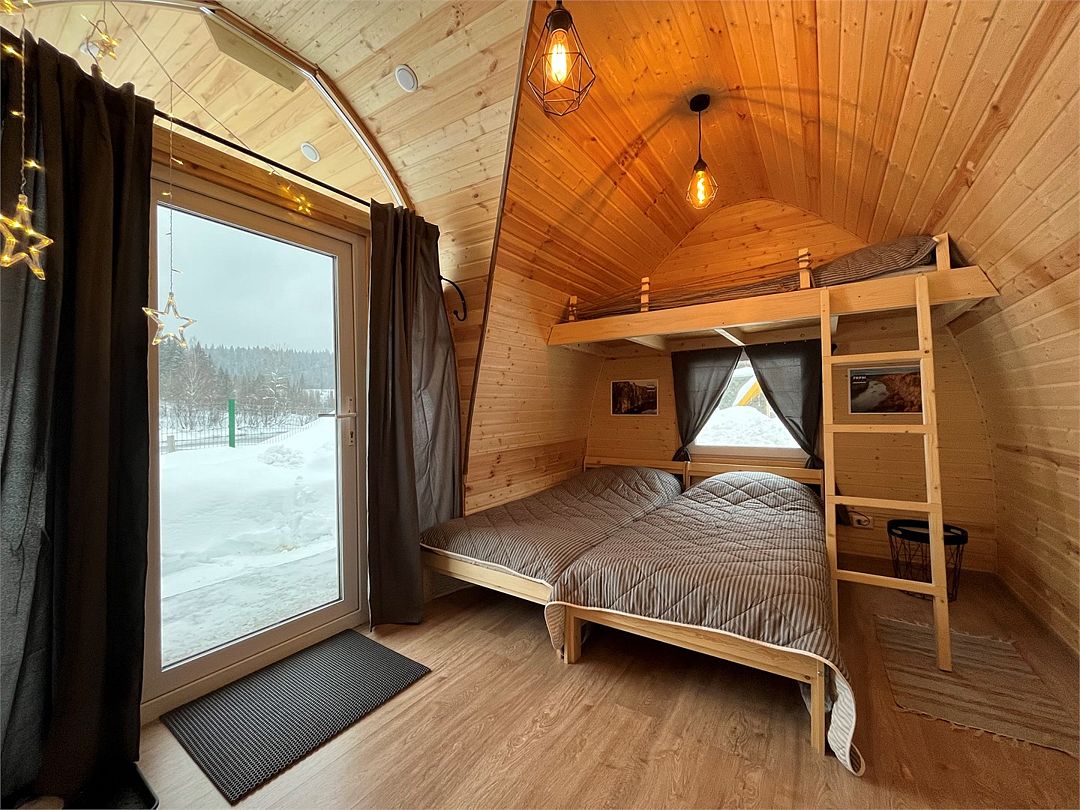 Домик на берегу реки Усьва с панорамным входом. В доме есть 2 двухъярусные кровати, по запросу предоставляется дополнительное спальное место.