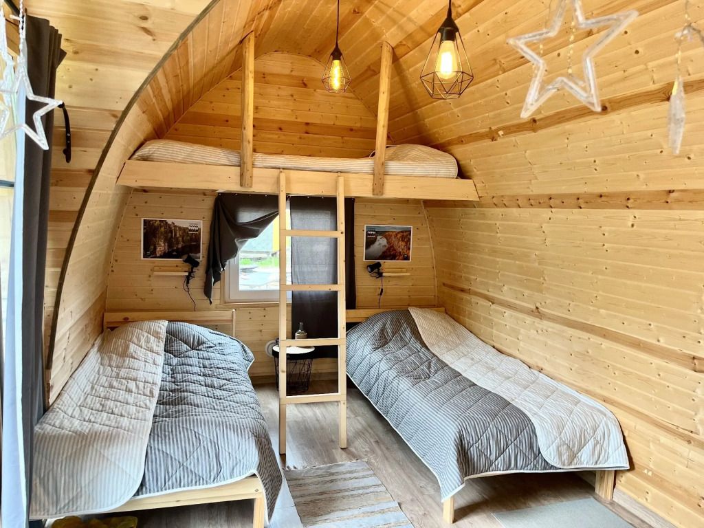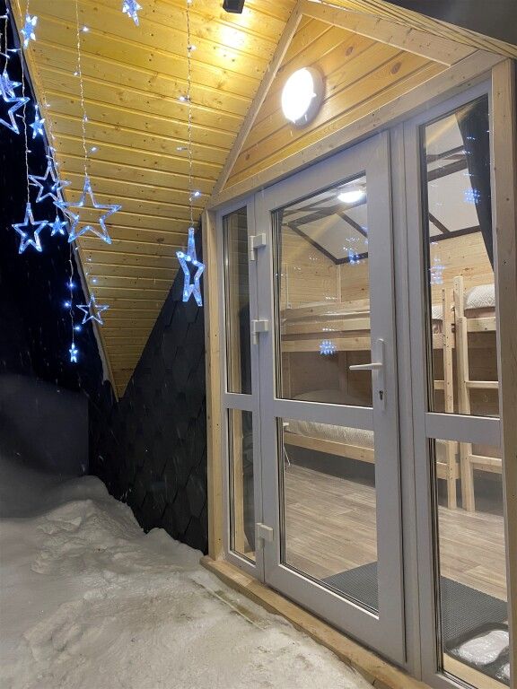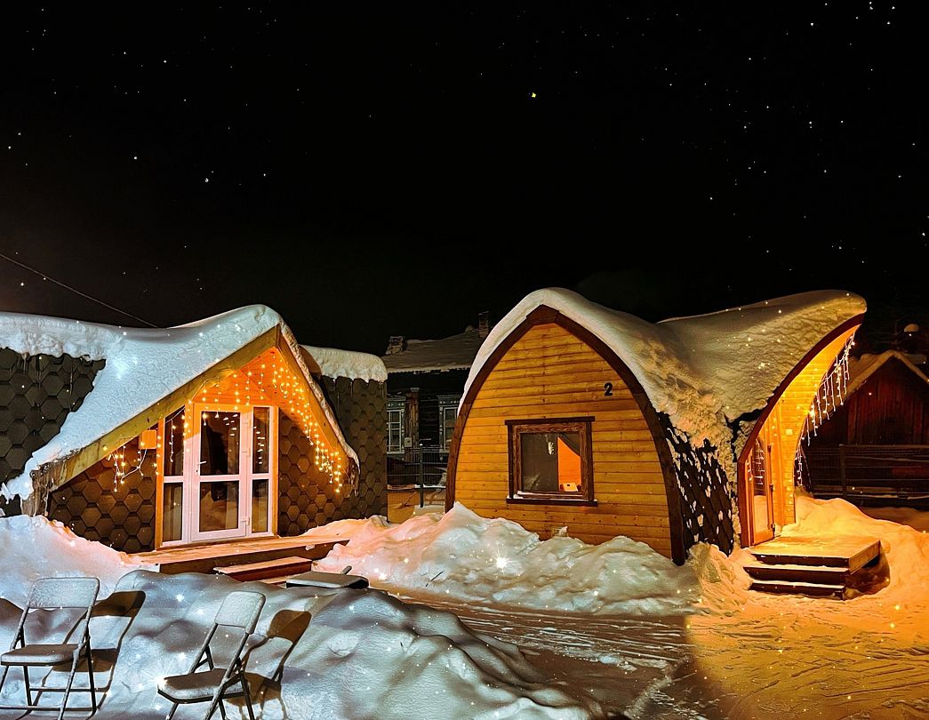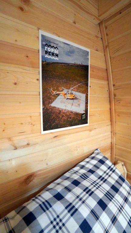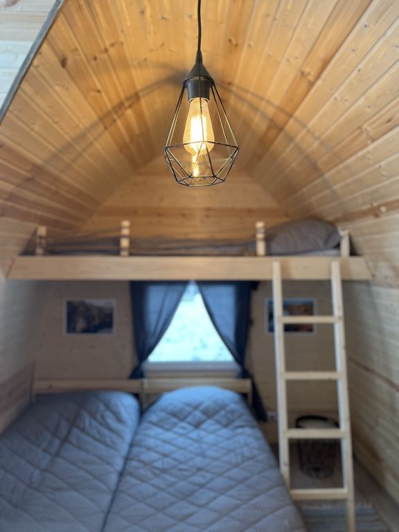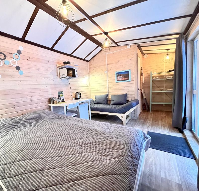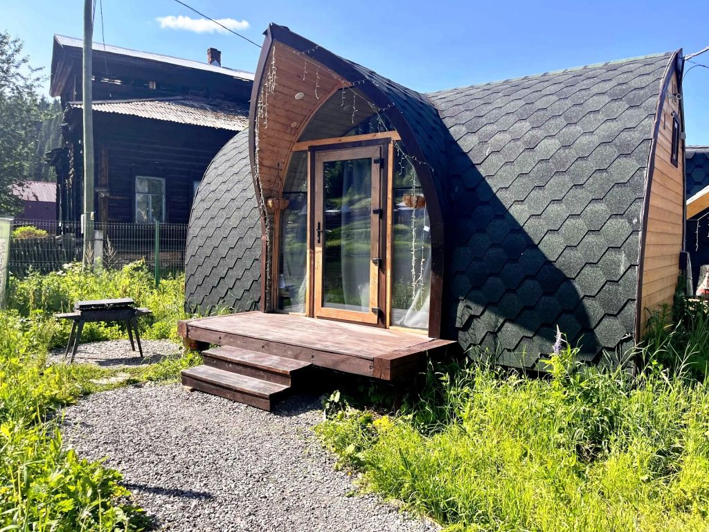 Домик на берегу реки Усьва с панорамным входом. В доме есть 2 двухъярусные кровати, по запросу предоставляется дополнительное спальное место.
