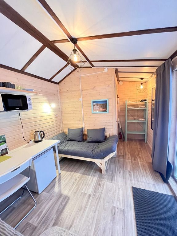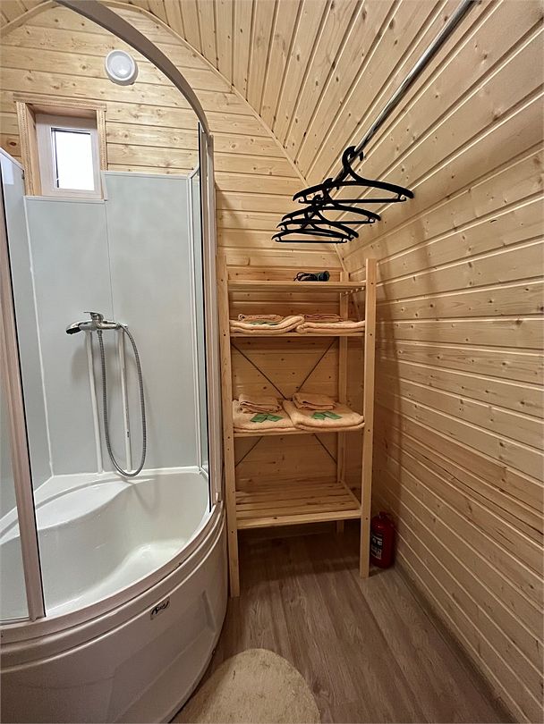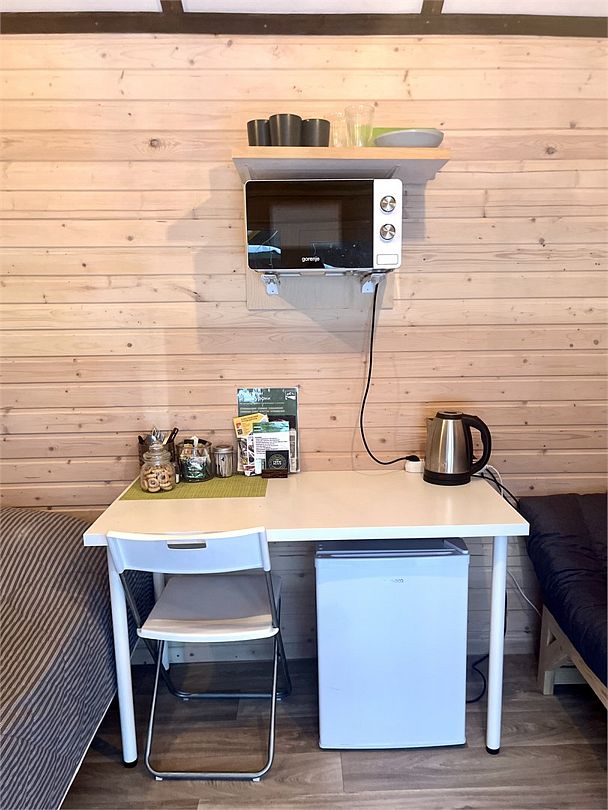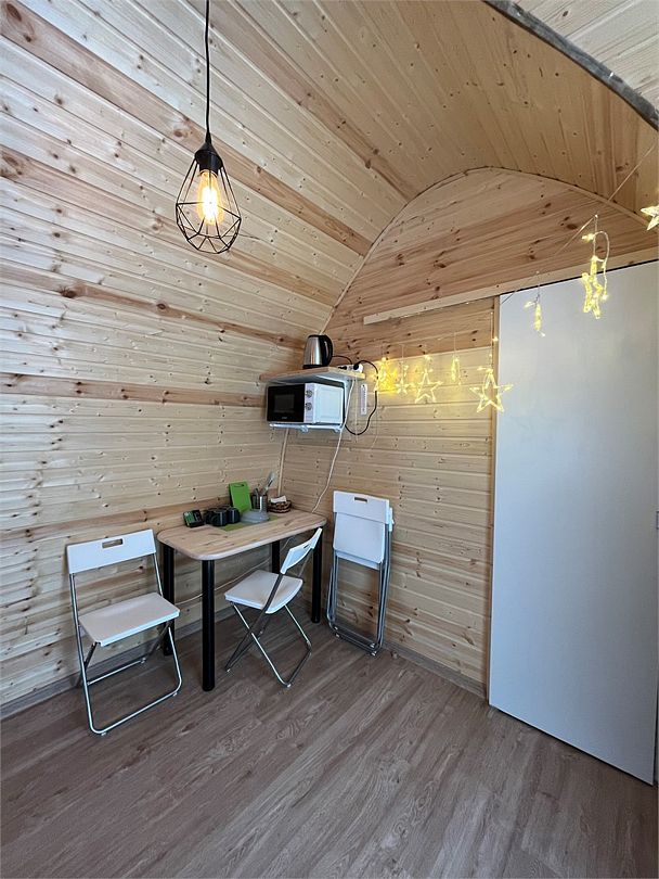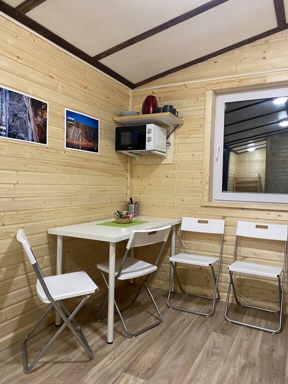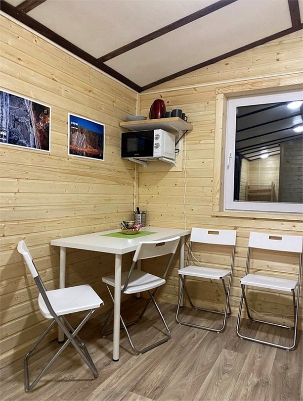 В домах есть все, что нужно для комфортного отдыха на природе: обеденная зона со столом и стульями, микроволновая печь, чайник, небольшой холодильник, необходимая посуда, стеллаж и плечики для вещей, собственный санузел с душем.