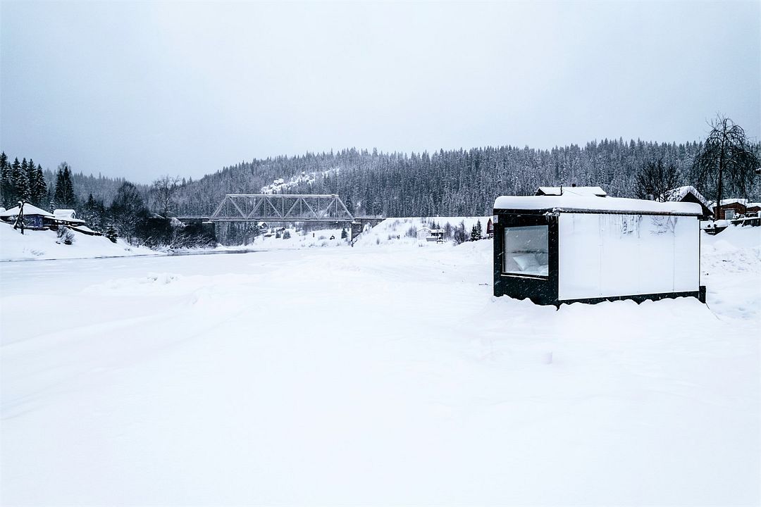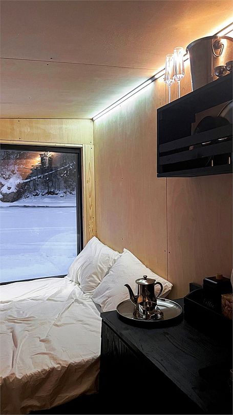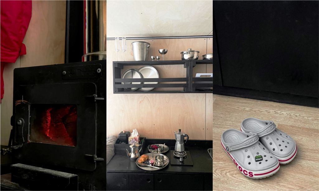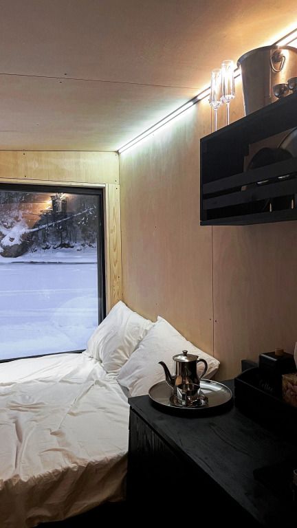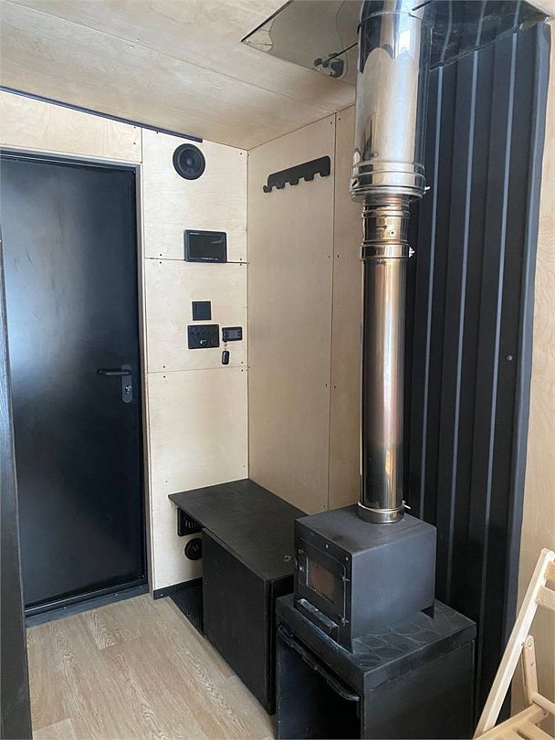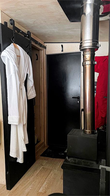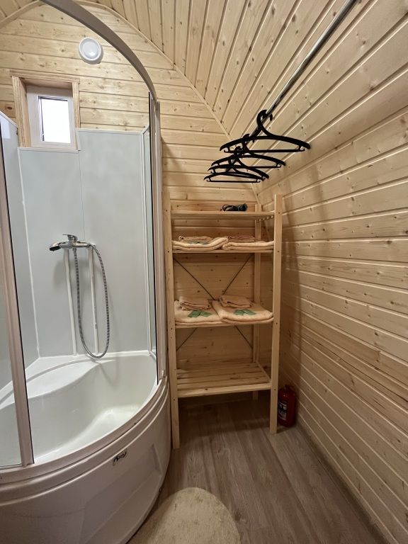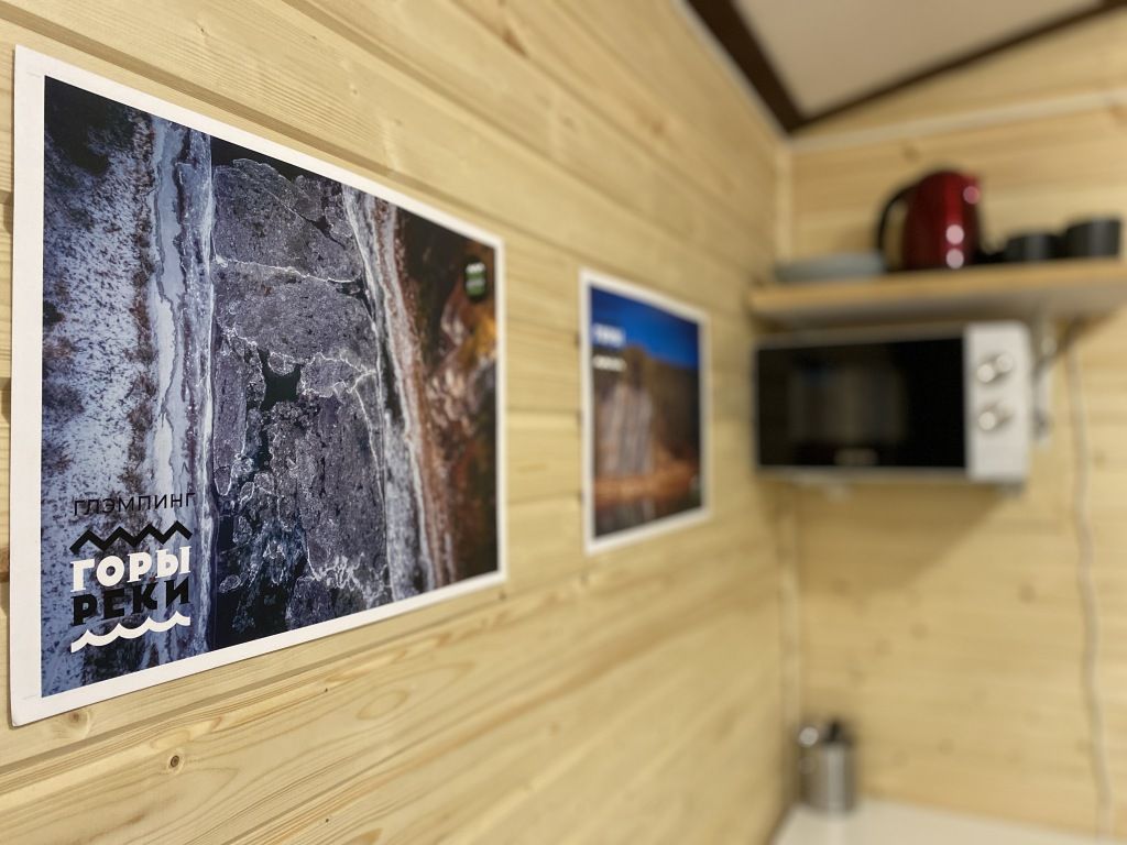 Горячая вода подается от газового котла и ограничена 50 литрами (может быть увеличена по просьбе гостей). Отопление идет от теплового конвектора, печи на дровах или автономного отопителя. Туалет кассетный био. Есть душ. Кухня с газовой плитой, всей необходимой посудой, бокалами и ведром для шампанского. Холодильник в наличии. Также для гостей есть банные халаты, кроксы (обработанные антисептиком) и набор банных полотенец. Самое главное — это вид, который открывается вам через большое панорамное окно. Дом мобильный, сейчас он стоит на берегу реки Усьва с видом на реку, скалу и хвойный лес.