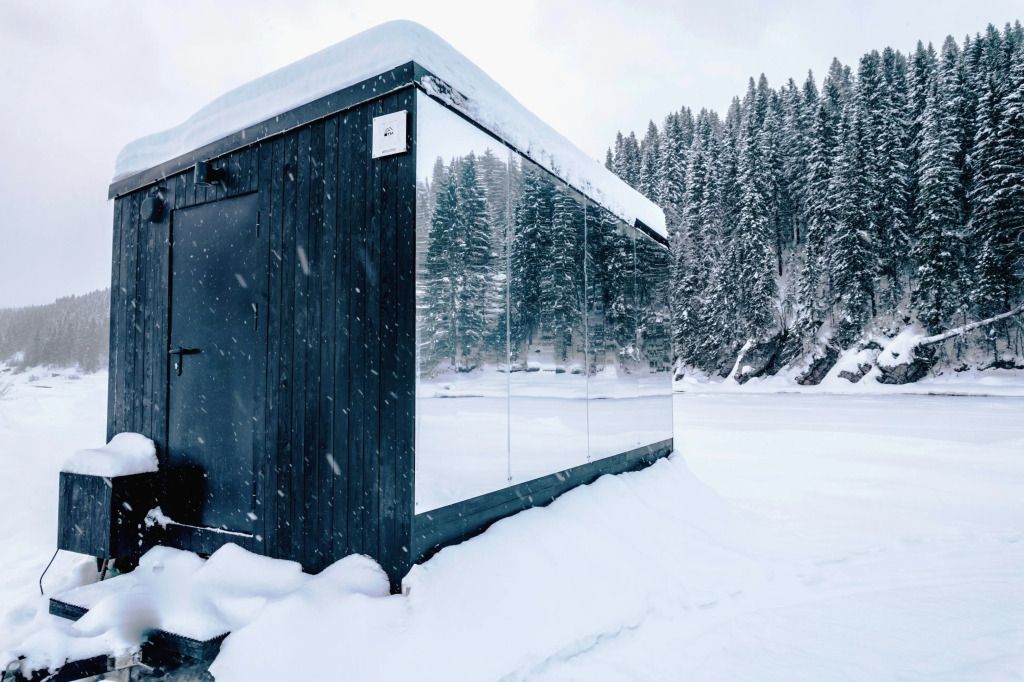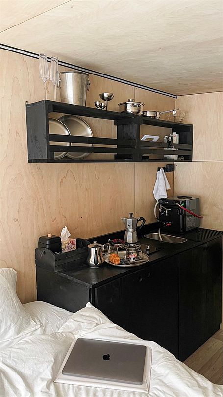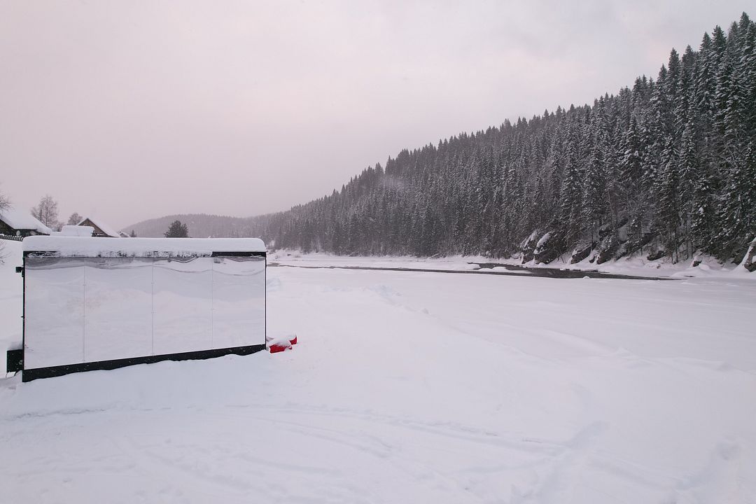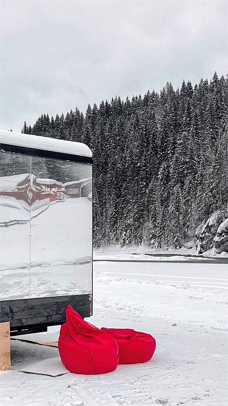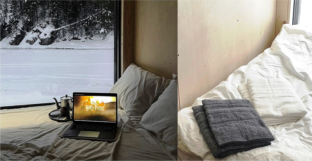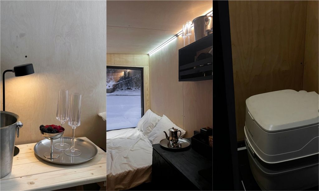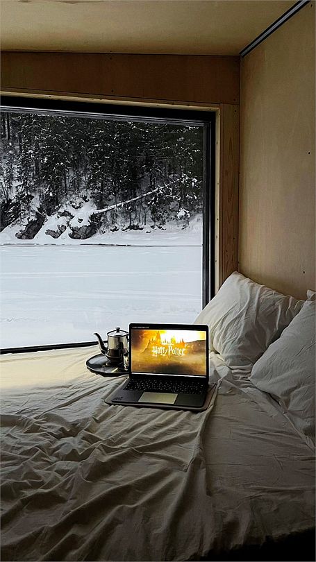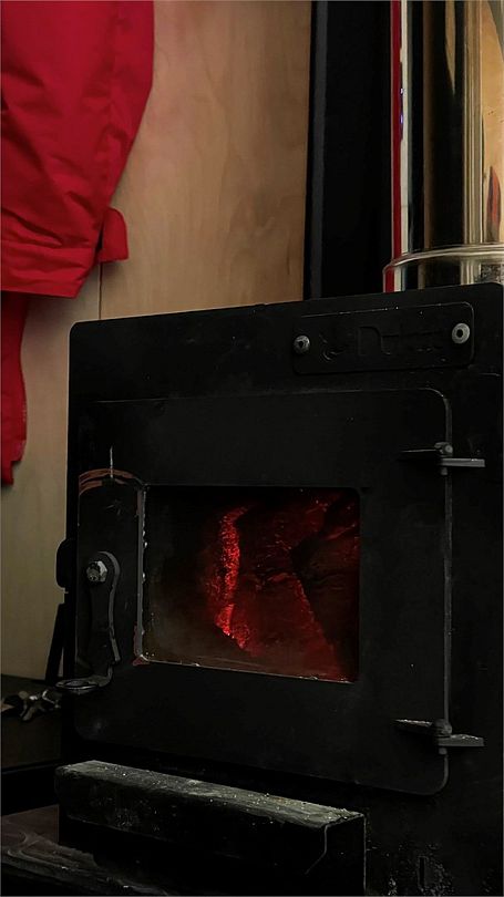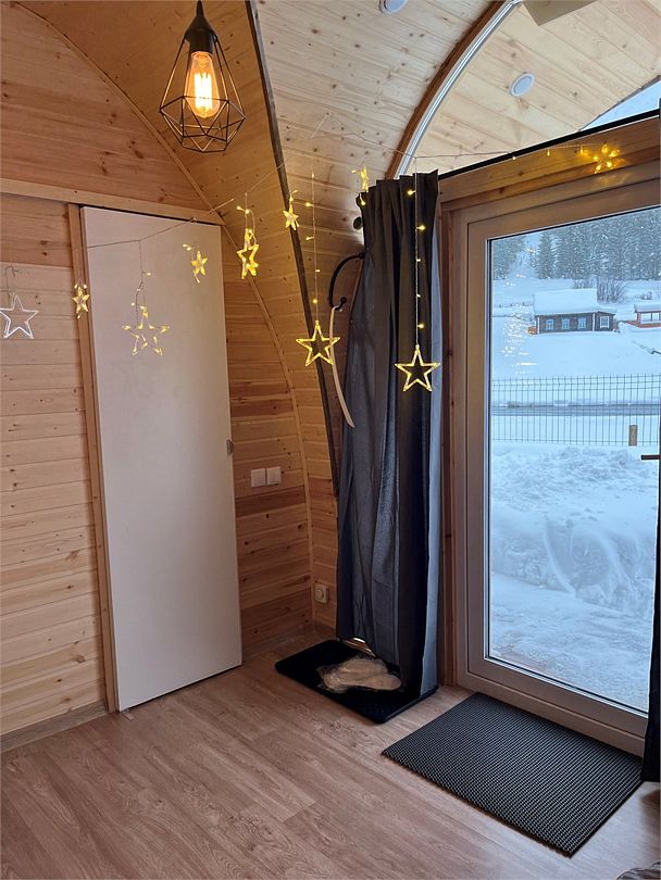 Горячая вода подается от газового котла и ограничена 50 литрами (может быть увеличена по просьбе гостей). Отопление идет от теплового конвектора, печи на дровах или автономного отопителя. Туалет кассетный био. Есть душ. Кухня с газовой плитой, всей необходимой посудой, бокалами и ведром для шампанского. Холодильник в наличии. Также для гостей есть банные халаты, кроксы (обработанные антисептиком) и набор банных полотенец. Самое главное — это вид, который открывается вам через большое панорамное окно. Дом мобильный, сейчас он стоит на берегу реки Усьва с видом на реку, скалу и хвойный лес.