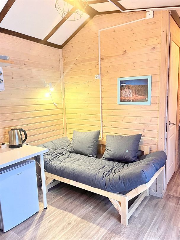 В домах есть все, что нужно для комфортного отдыха на природе: обеденная зона со столом и стульями, микроволновая печь, чайник, небольшой холодильник, необходимая посуда, стеллаж и плечики для вещей, собственный санузел с душем. В «А-доме» находится кухня общего пользования для приготовления еды: плитка и необходимая посуда в вашем распоряжении.