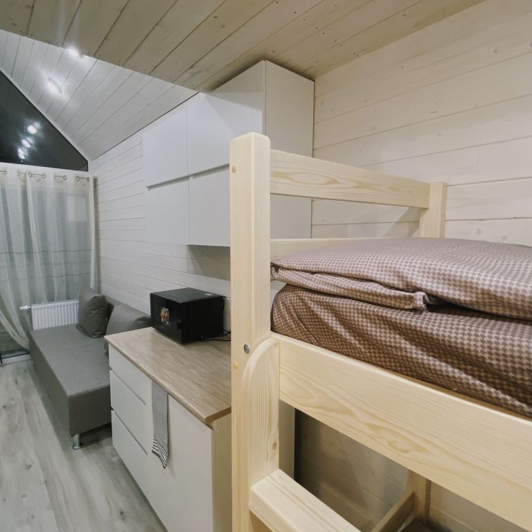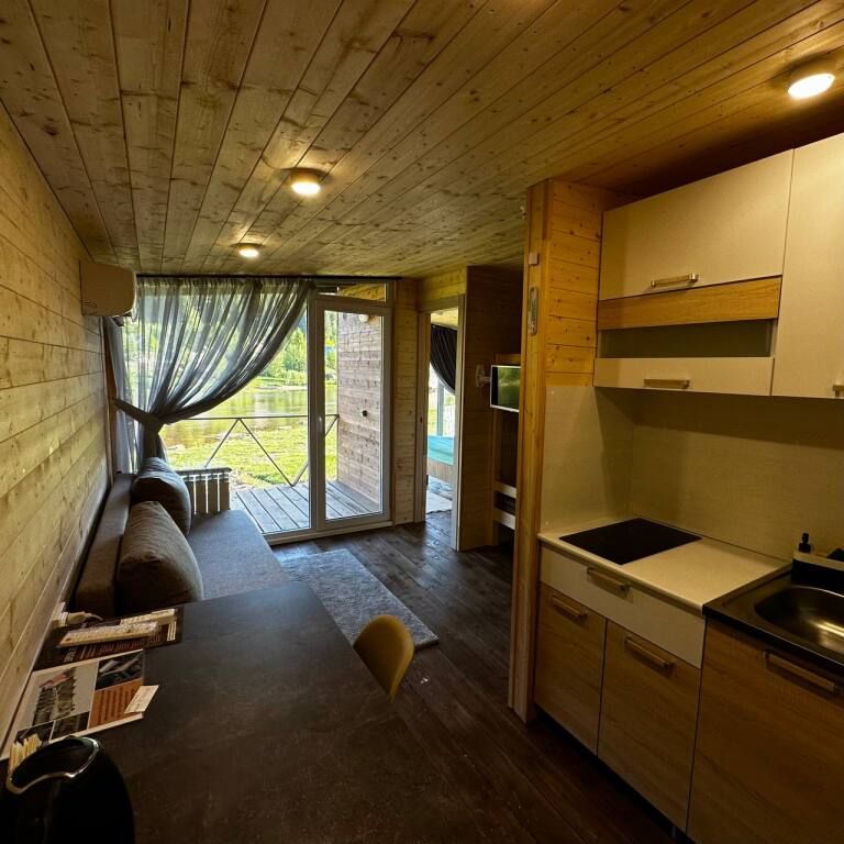 На территории глэспинга есть уютные домики, баня с купелью, чан, кухонная зона, аренда лодок, сап-бордов и детская площадка для самых маленьких гостей.