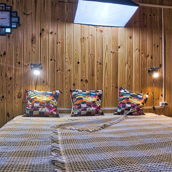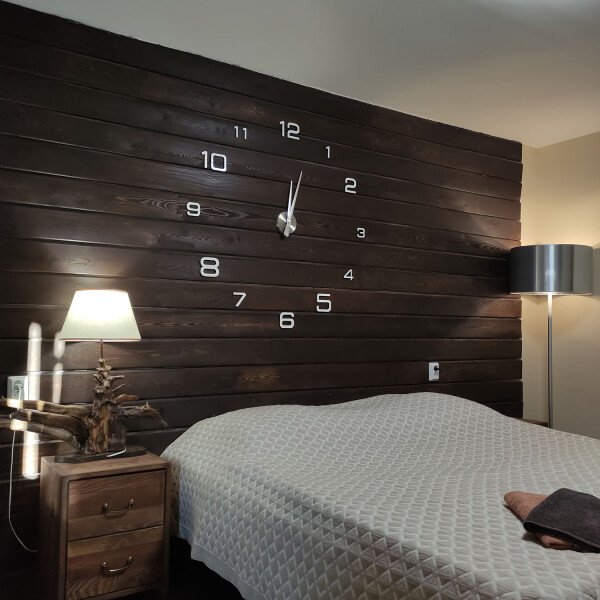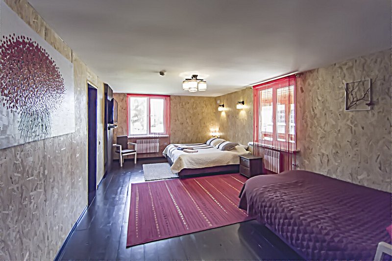 Внутри вы найдёте три комфортабельные комнаты: две просторные комнаты оборудованы кроватями King Size (1800×2000) и удобными полноразмерными диванами «Клик-кляк», предоставляя много места для отдыха. Одна компактная, но уютная комната с большой двуспальной кроватью идеально подойдет для тех, кто ищет уединения.