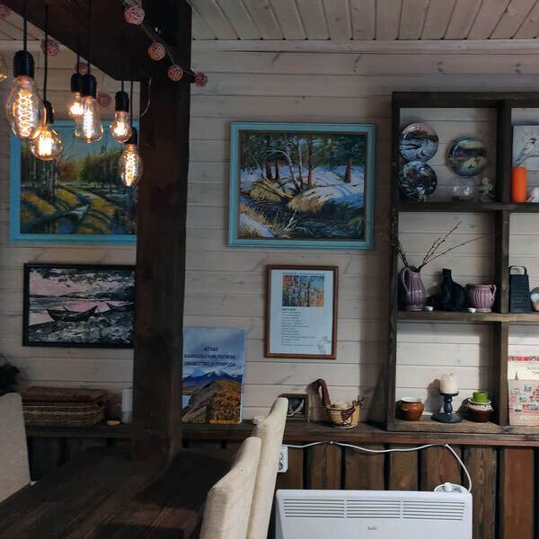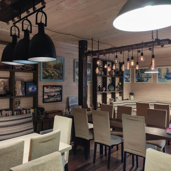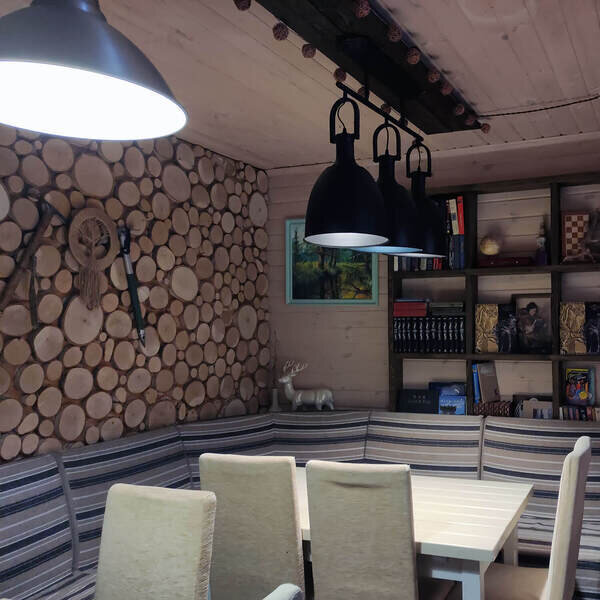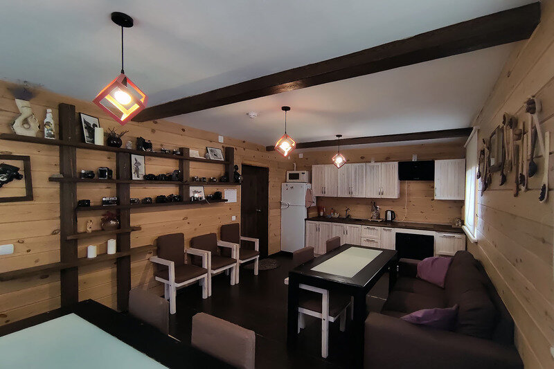 На первом этаже расположена стильная кухня-гостиная, где можно собраться за общим столом. В её интерьере — уникальная коллекция винтажных советских фотоаппаратов, добавляющая атмосферности и ретро-шарма. Просторная гостиная рассчитана на комфортное размещение до 12 человек, что делает её прекрасным местом для тёплых встреч и праздников.