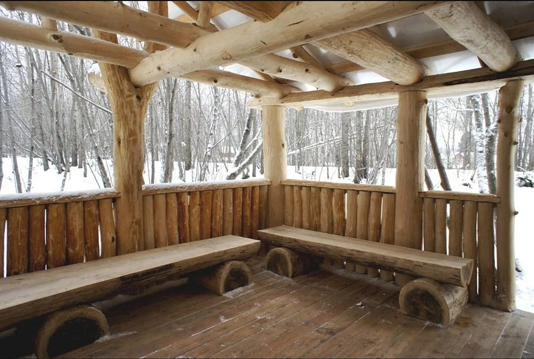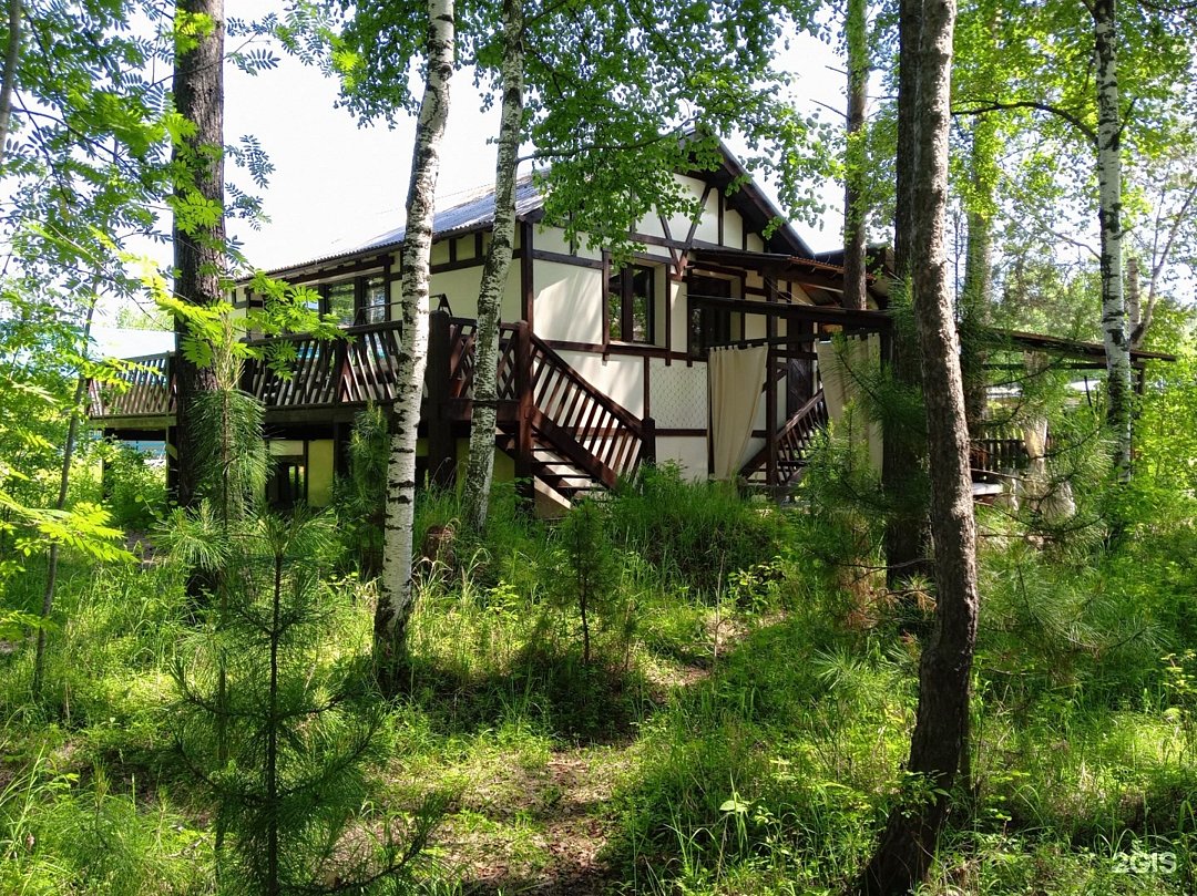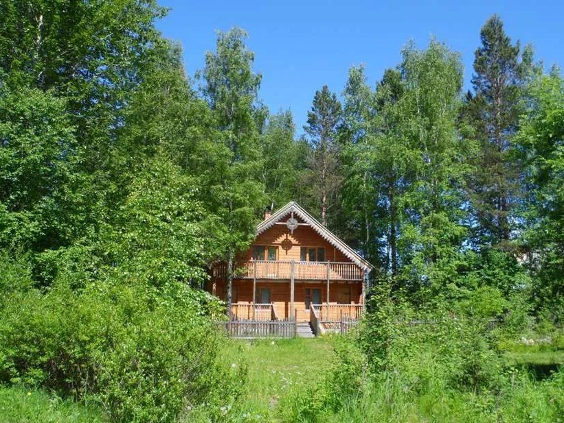 Особое внимание заслуживает главный дом с камином, построенный по традициям русского деревянного зодчества. Использование соснового и лиственничного бруса, изящные резные украшения с символикой Солнца на фасаде создают неповторимую атмосферу тепла и уюта — идеальный вариант для большой компании или семьи.