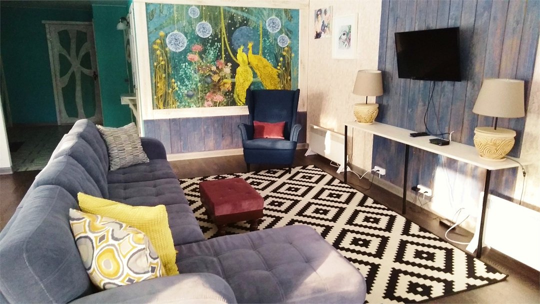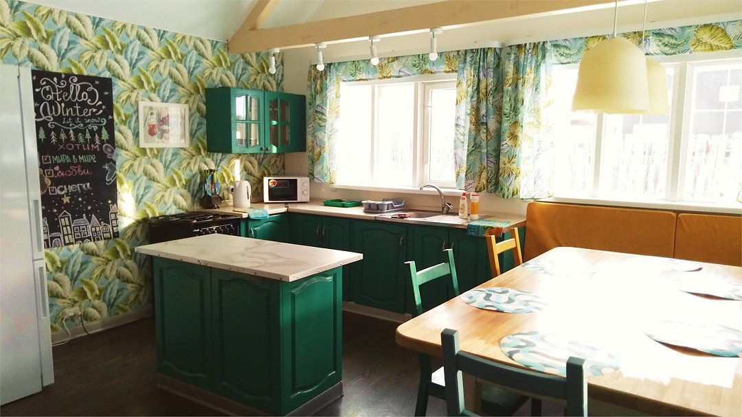 Домик для отпуска удобен для семьи или компании друзей. Здесь много света, цвета, все сделано творчески, с душой. Для удобства гостей — три отдельных спальни, просторная гостиная со столовой, кухонной зоной, два санузла (один из них с душем).