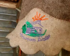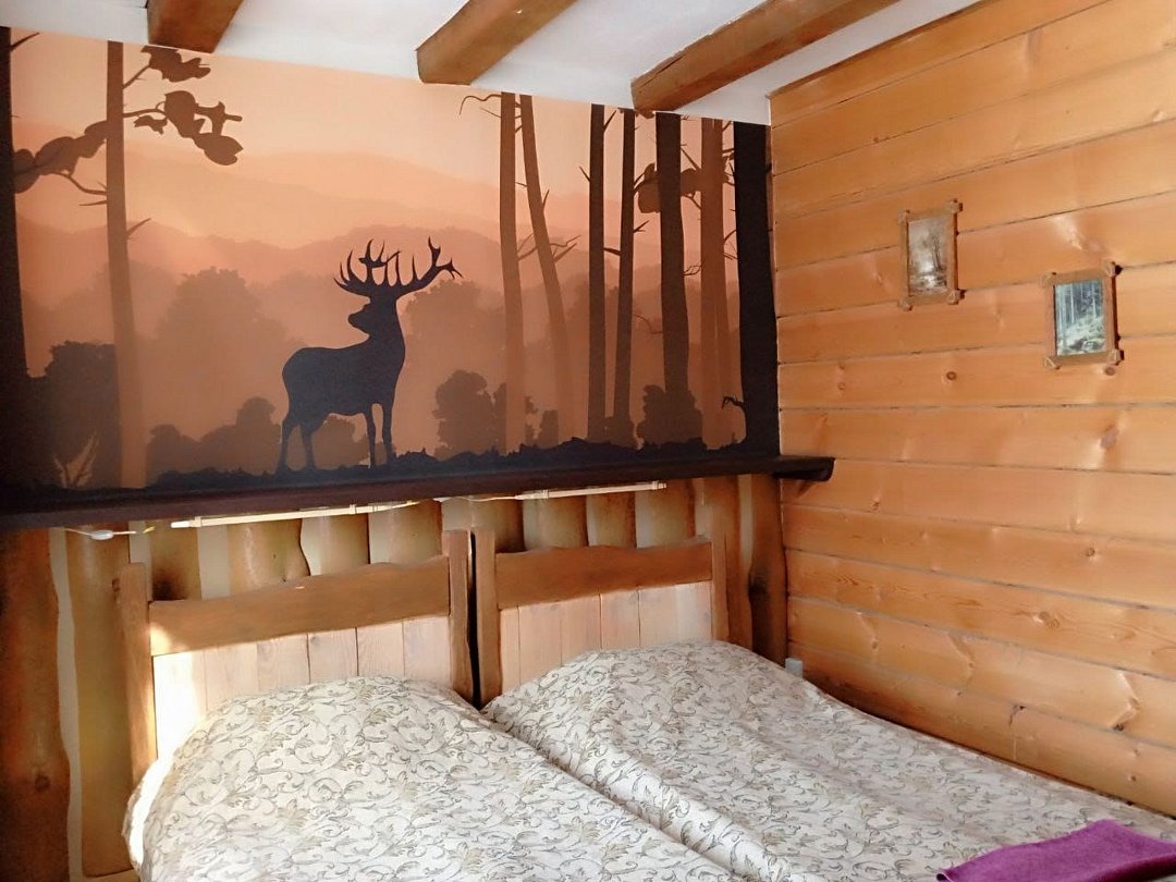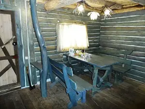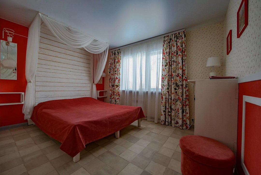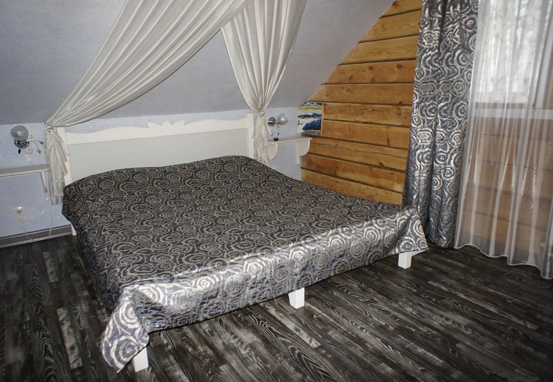 Двухместный номер «Полянка» расположен на первом этаже «Дома с камином» и имеет отдельный вход, что обеспечивает некоторую приватность. Здесь двуспальная кровать, санузел с душем.