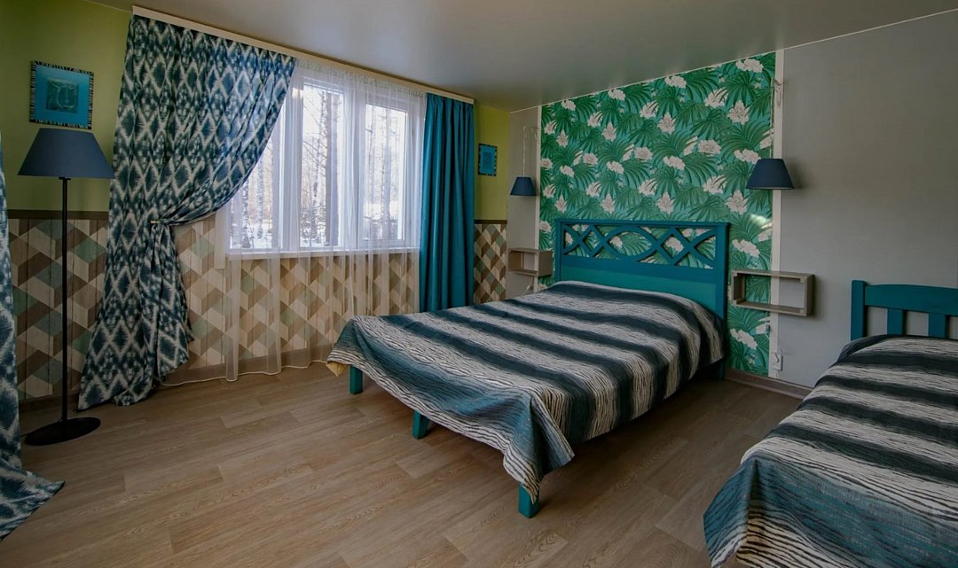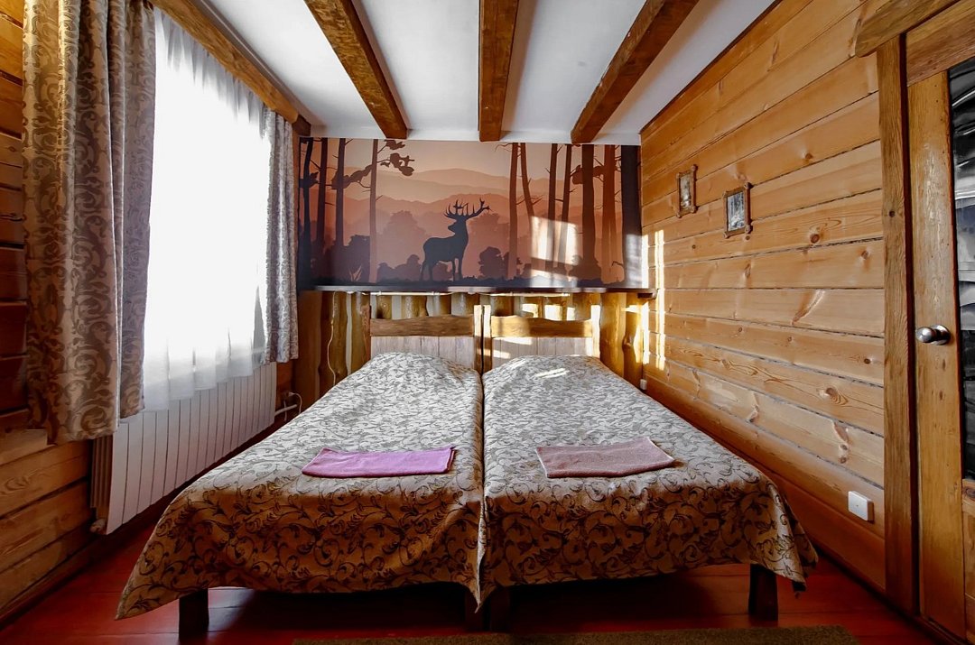 Двухместная гостевая комната «Таежная» в «Доме с камином» расположена на первом этаже и имеет отдельный вход с улицы. Здесь две раздельные кровати, санузел с душем.