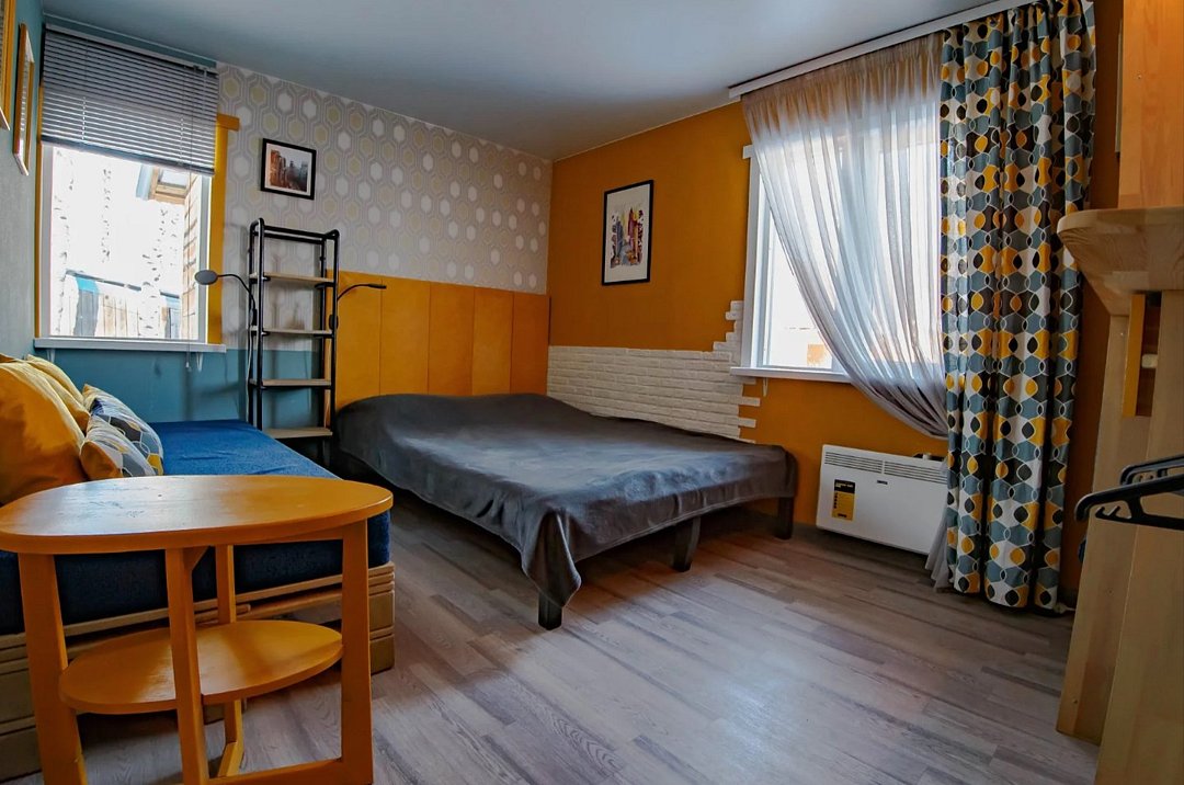 Двухкомнатный номер расположен на втором этаже в «Доме с камином». Здесь удобно разместится семья с детьми: двуспальная кровать в одной, диван в другой, санузел.