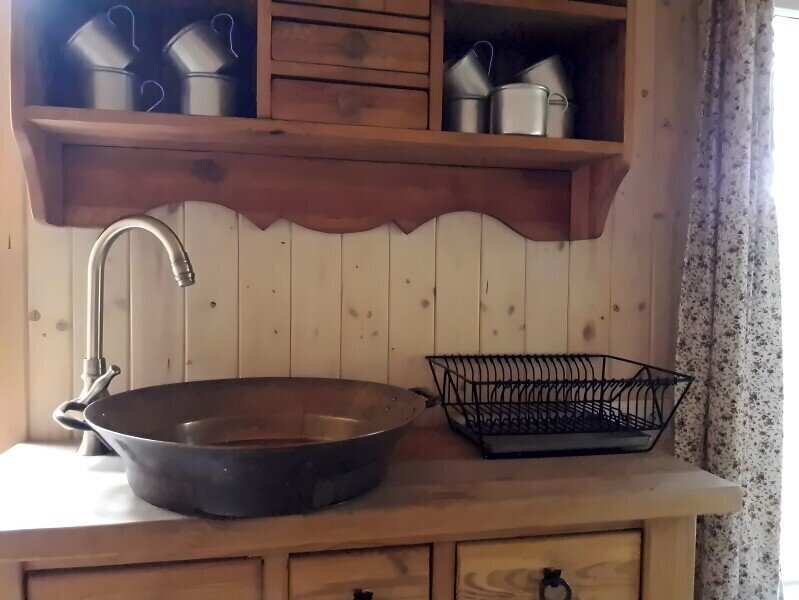 Что есть в доме: газовая варочная 4х конфорочная поверхность, эл. духовой шкаф, микроволновая печь, кастрюли (1,2,5 литров), сковородки (блинницы нету). Салатники, сервировочная посуда. Для 8 персон: тарелки, бокалы, стаканы, ложки, вилки, ножи, кружки, тарелки десертные, тарелки для вторых блюд, суповые тарелки.