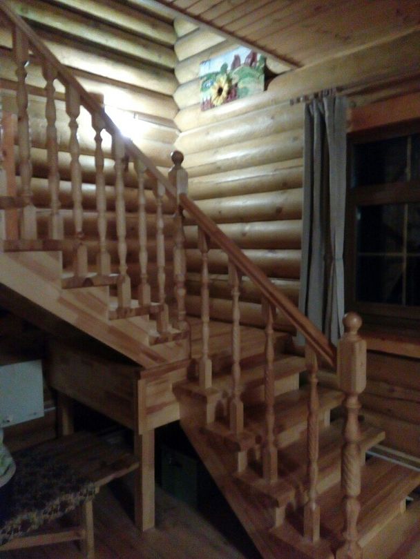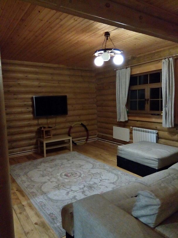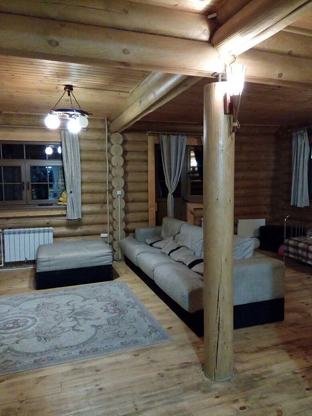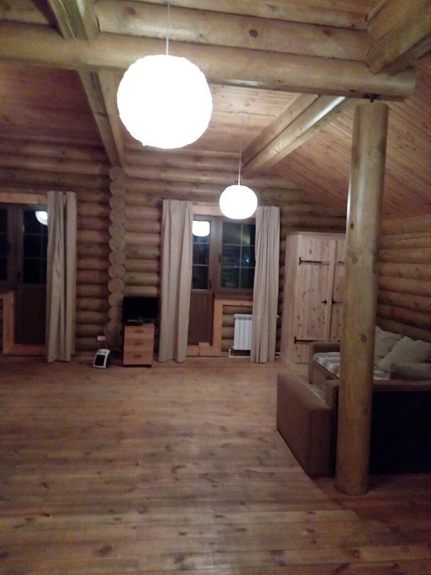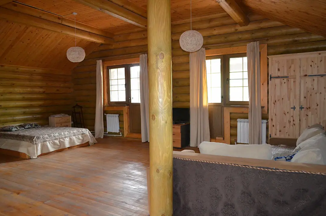 На первом этаже кухня, гостиная и санузел. В гостиной 2 односпальных дивана. На втором этаже в спальных зонах (отдельных комнат нет) 4 двуспальных кровати и 2 односпальных дивана, санузел.