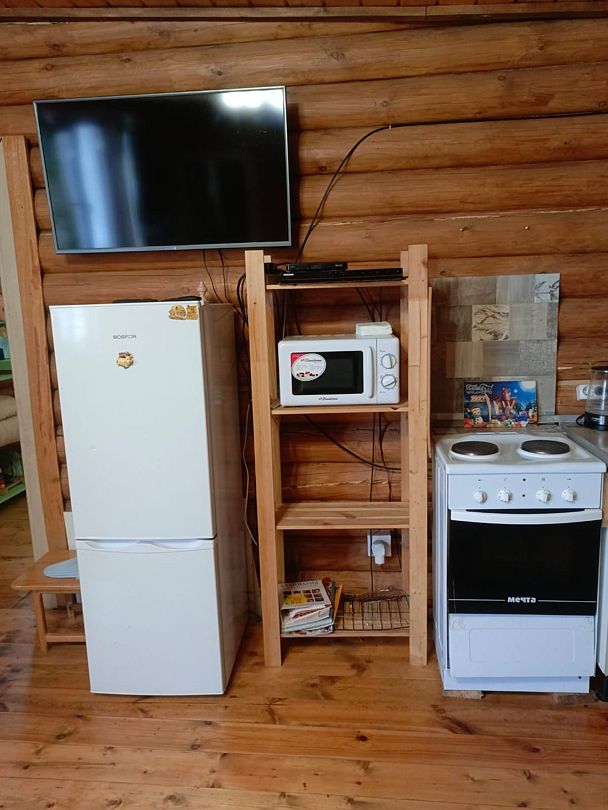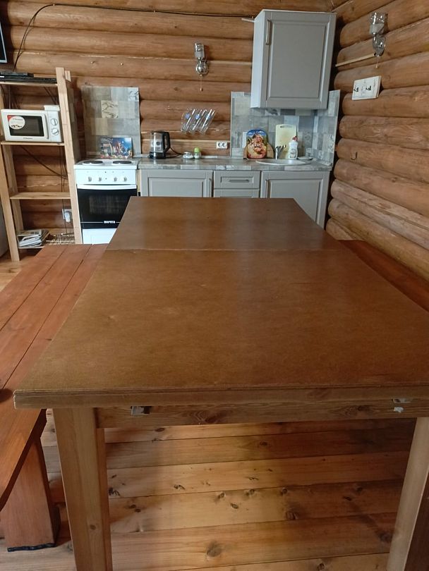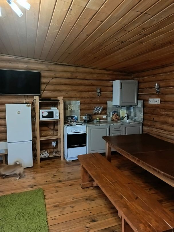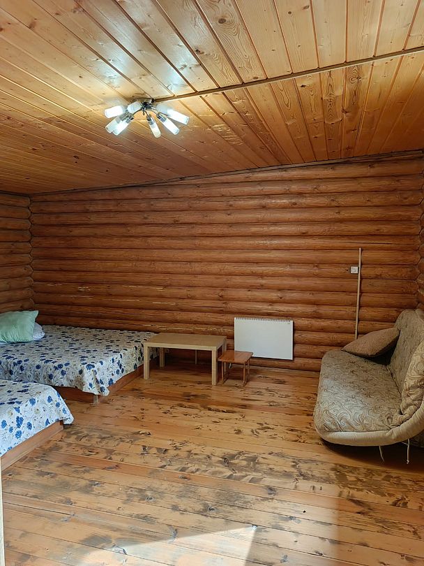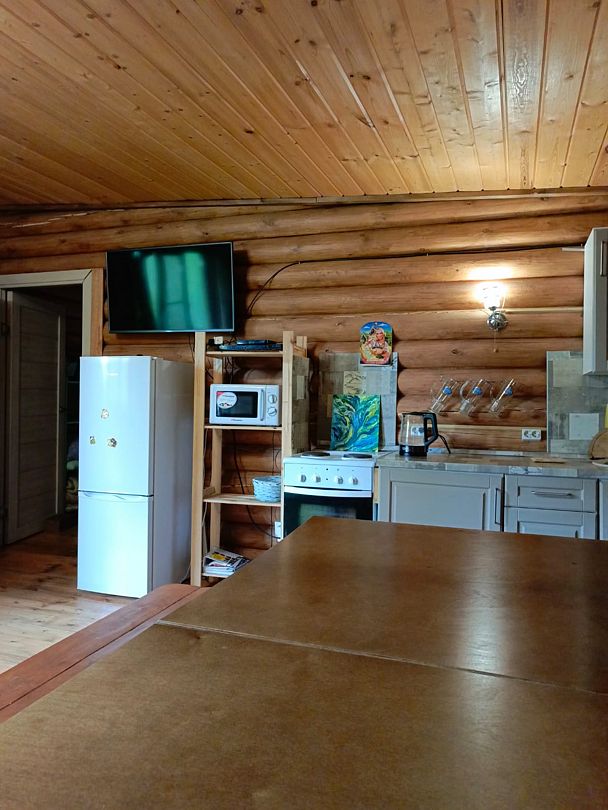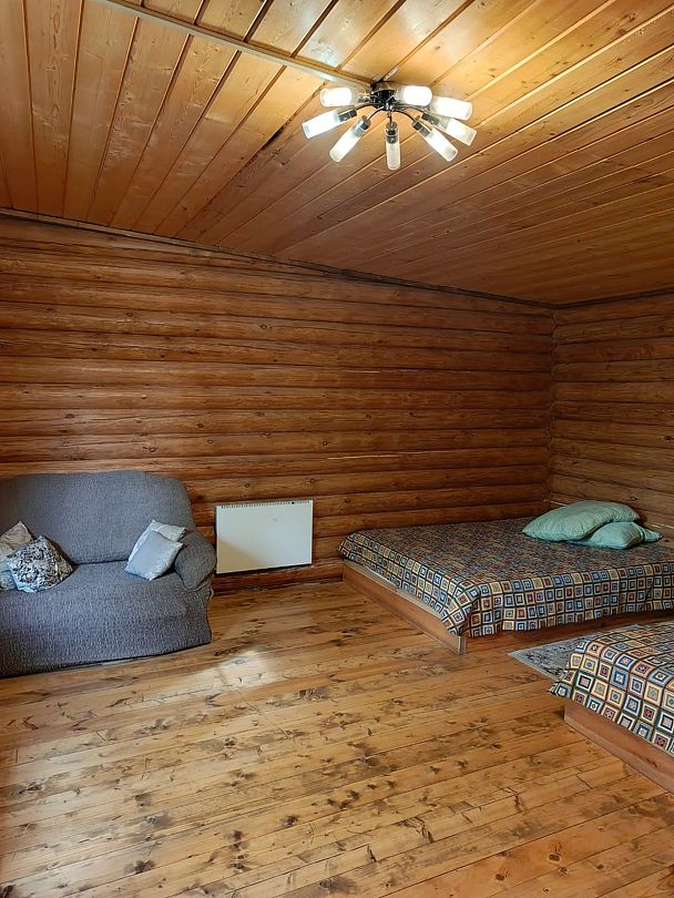 Центральное место занимает просторная гостиная, объединенная с кухней. Здесь вас ждет все необходимое для комфортного отдыха: большой обеденный стол, вмещающий всех гостей, уютный диван, скамьи, телевизор, микроволновая печь, электроплита с духовкой и полный набор посуды на 11 персон, а также электрочайник. В гостиной также расположен односпальный диван.