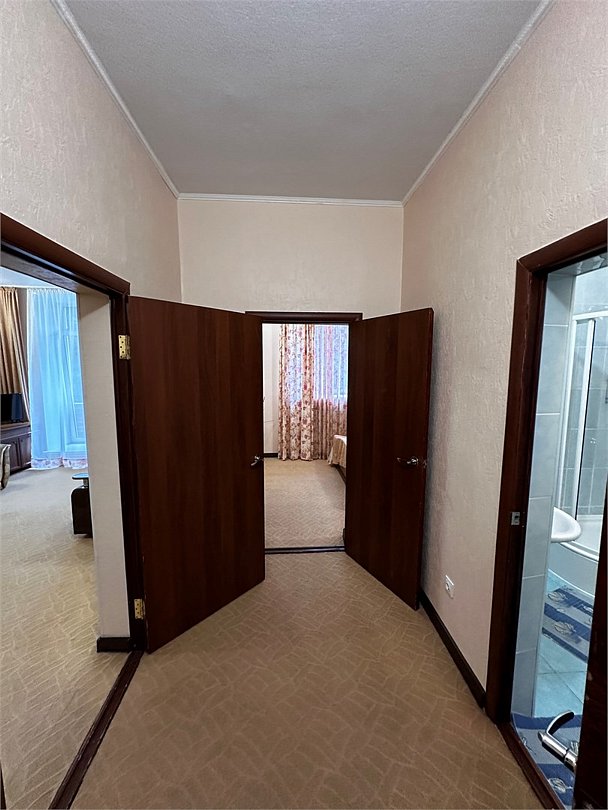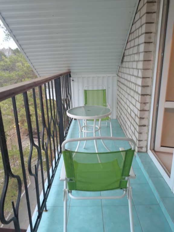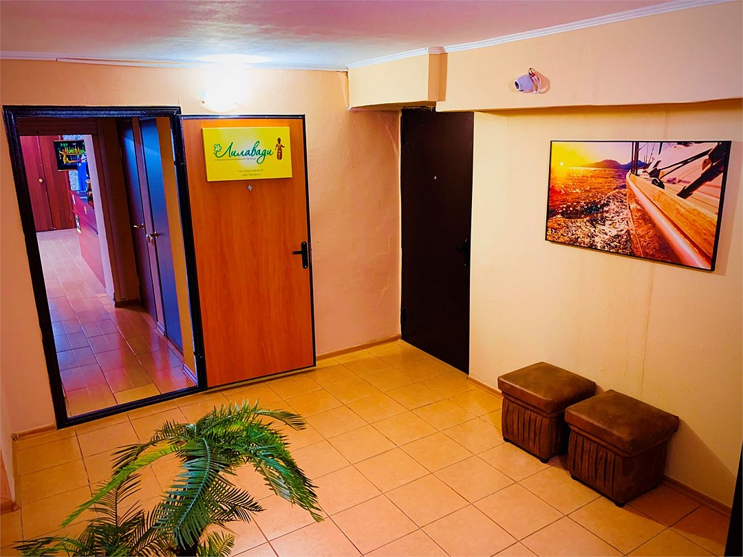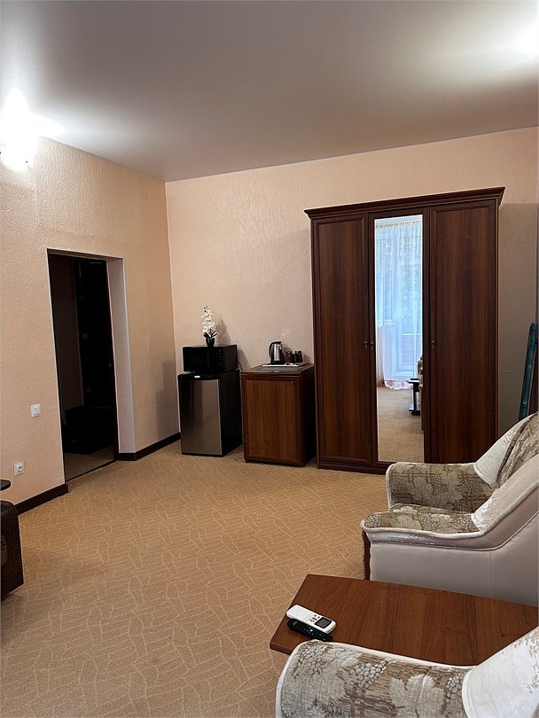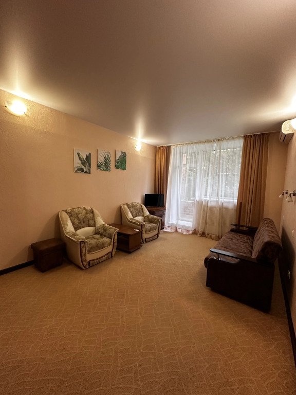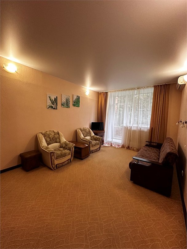 Двухкомнатный номер с кухней (с небольшой барной стойкой , с плитой, микроволновкой , холодильник, чайник, посуда и столовые приборы), двухспальная кровать, два дивана раскладывающихся, два раскладывающихся кресла-кровать. В каждой комнате и на кухне имеются теплый электро полы, установлен, кондиционер, лоджия, ванная комната (душевая , санузел, стиральная машина), телевизор, чайник, микроволновка, посуда, фен, сушилка для белья, утюг , гладильная доска. На лоджии столик и два кресла.Услуги и удобства