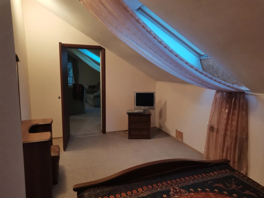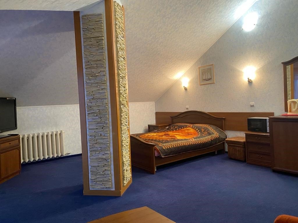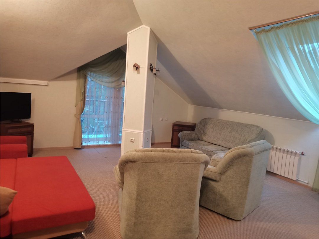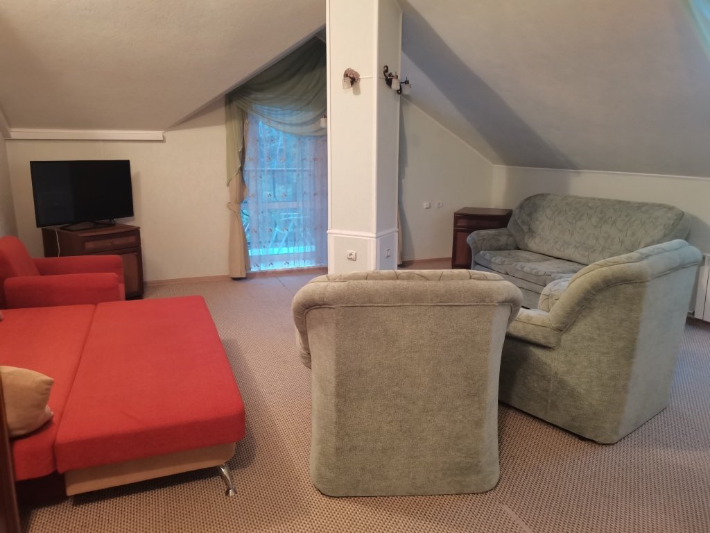 два телевизора, DVD-плеер, Wi-Fi, холодильник, кондиционер, светильник, фен, вентилятор, плита для приготовления пищи, микроволновая печь, утюг, обогреватель, душевая кабина, халаты, тапочки, лоджия, двуспальная кровать, диван, кресла, шкаф для одежды, вешалки, журнальный столик, барная стойка, пуфики, мягкая мебель, стул, мансардные окна, пуфик, кресло-кровать, вешалки-плечики, мыло, зеркало в полный рост, без питомцевВ номере