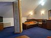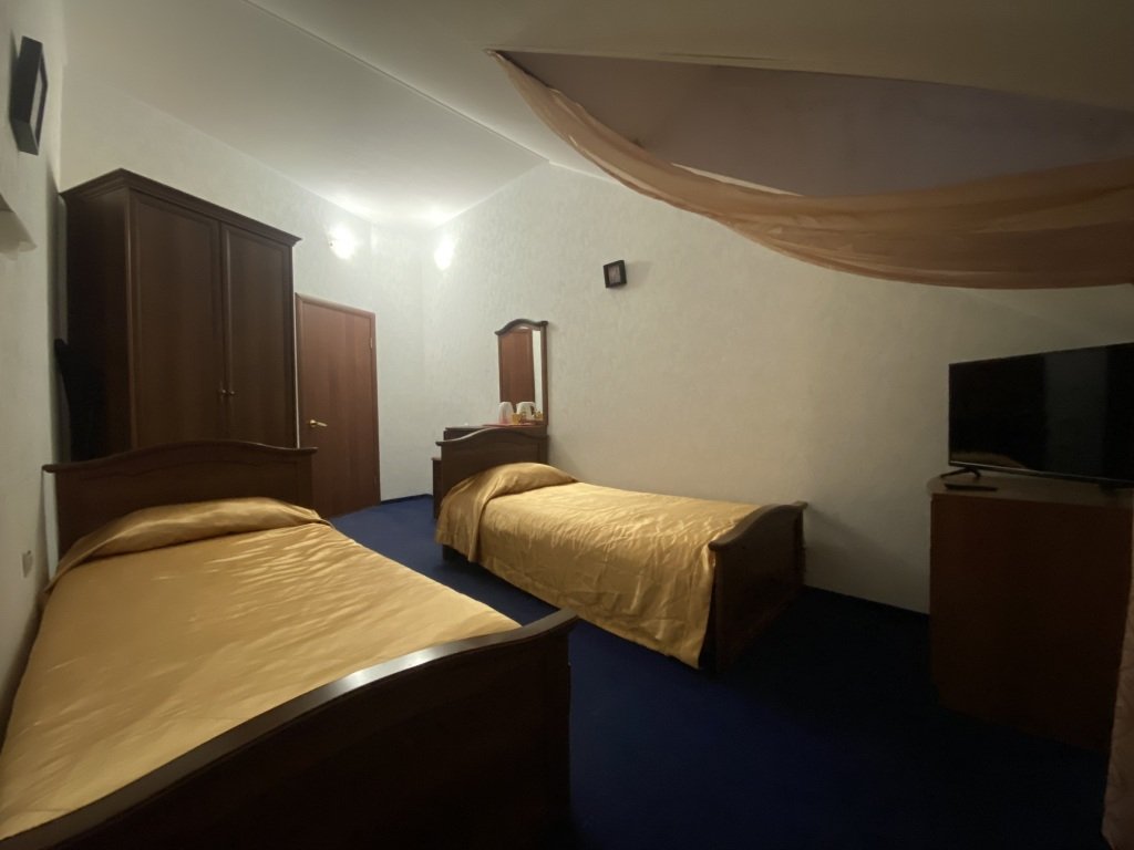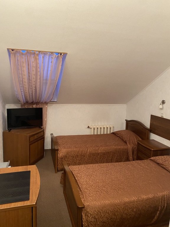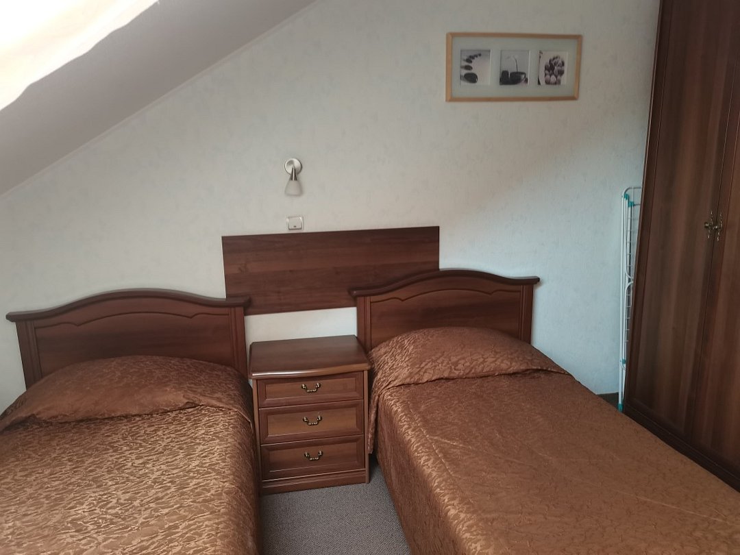 Wi-Fi, фен, микроволновая печь, утюг, душевая кабина, санузел, водонагреватель, тапочки, две односпальные кровати, гладильная доска, шкаф для одежды, журнальный столик, пуфики, чайный набор, чайник, ковровое покрытие, душ, столовые приборы, туалетные средства, сушилка для белья, телевизор с плоским экраном, мини-холодильник, мансардные окна, фумигатор, уборка номера, услуги прачечной (платно), вешалки-плечики, мыло, зеркало в полный рост, без питомцевВ номере