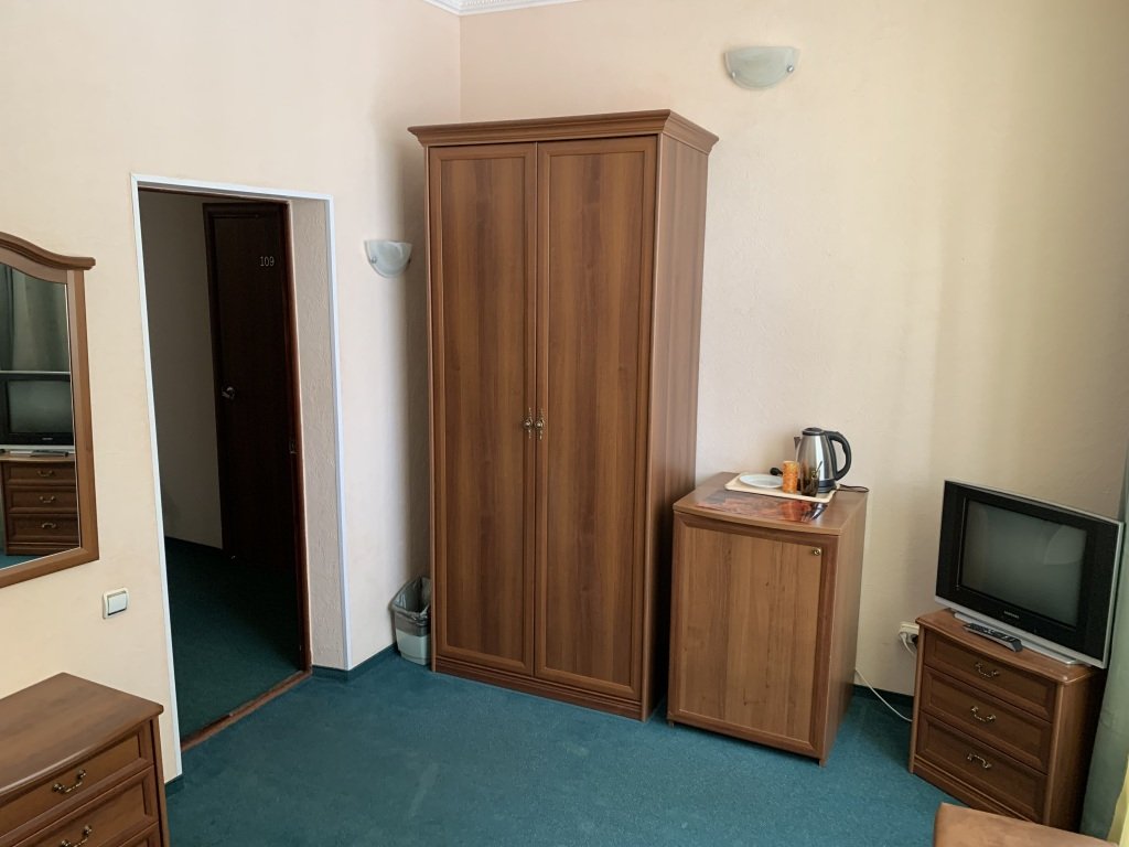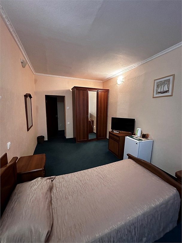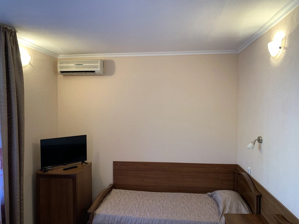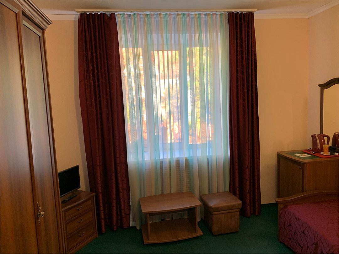 телевизор, Wi-Fi, фен, вентилятор, утюг, обогреватель, душевая кабина, халаты, банные полотенца, пляжные полотенца, тапочки, балкон, односпальная кровать, шкаф для одежды, журнальный столик, зеркало, унитаз, раковина, кулер на этаже, вид во двор, внешняя ванная комната, туалетные средства, мини-холодильник, пуфик, вешалки-плечики, мыло, без питомцевВ номере